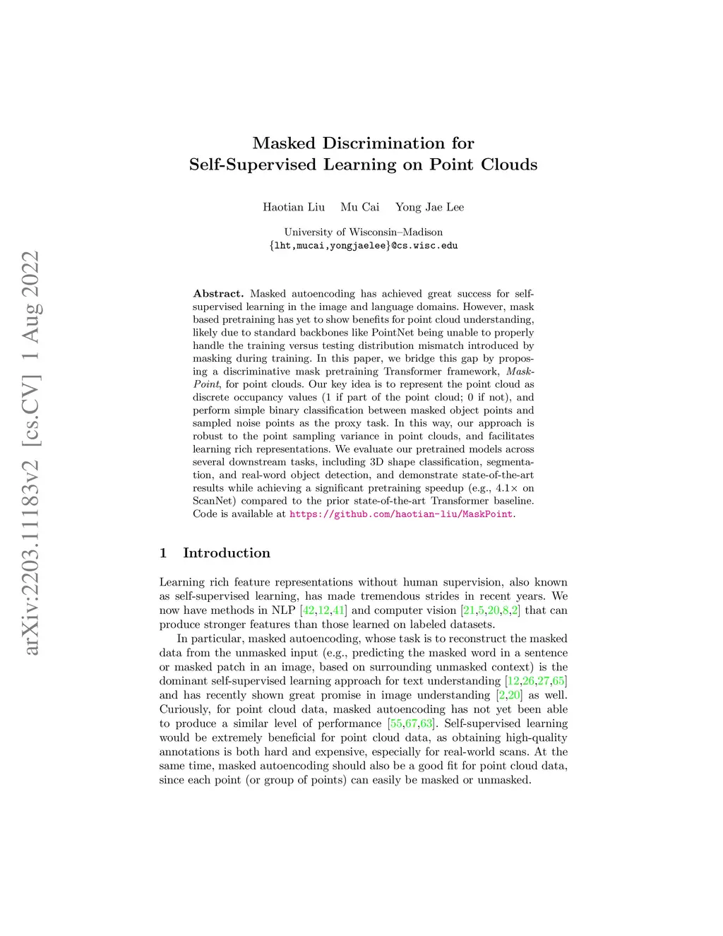 Masked autoencoding has achieved great success for self-supervised learning in the image and language domains. However, mask based pretraining has yet to show benefits for point cloud understanding, likely due to standard backbones like PointNet being unable to properly handle the training versus testing distribution mismatch introduced by masking during training. In this paper, we bridge this gap by proposing a discriminative mask pretraining Transformer framework, MaskPoint}, for point clouds. Our key idea is to represent the point cloud as discrete occupancy values (1 if part of the point cloud; 0 if not), and perform simple binary classification between masked object points and sampled noise points as the proxy task. In this way, our approach is robust to the point sampling variance in point clouds, and facilitates learning rich representations. We evaluate our pretrained models across several downstream tasks, including 3D shape classification, segmentation, and real-word object detection, and demonstrate state-of-the-art results while achieving a significant pretraining speedup (e.g., 4.1x on ScanNet) compared to the prior state-of-the-art Transformer baseline. Code is available at https://github.com/haotian-liu/MaskPoint.