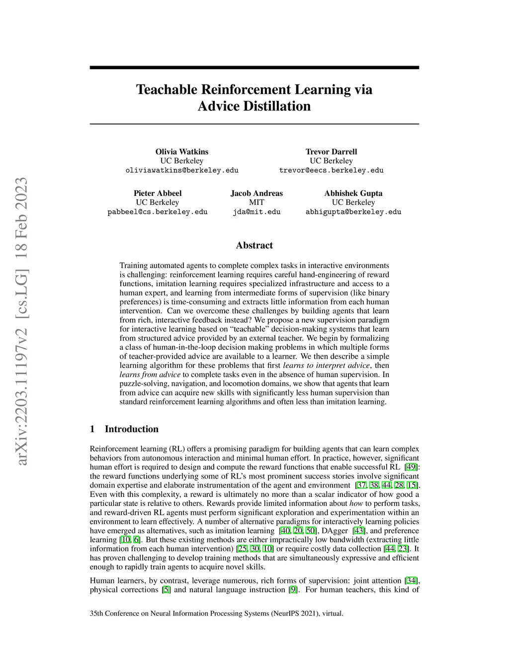 Training automated agents to complete complex tasks in interactive environments is challenging: reinforcement learning requires careful hand-engineering of reward functions, imitation learning requires specialized infrastructure and access to a human expert, and learning from intermediate forms of supervision (like binary preferences) is time-consuming and extracts little information from each human intervention. Can we overcome these challenges by building agents that learn from rich, interactive feedback instead? We propose a new supervision paradigm for interactive learning based on "teachable" decision-making systems that learn from structured advice provided by an external teacher. We begin by formalizing a class of human-in-the-loop decision making problems in which multiple forms of teacher-provided advice are available to a learner. We then describe a simple learning algorithm for these problems that first learns to interpret advice, then learns from advice to complete tasks even in the absence of human supervision. In puzzle-solving, navigation, and locomotion domains, we show that agents that learn from advice can acquire new skills with significantly less human supervision than standard reinforcement learning algorithms and often less than imitation learning.