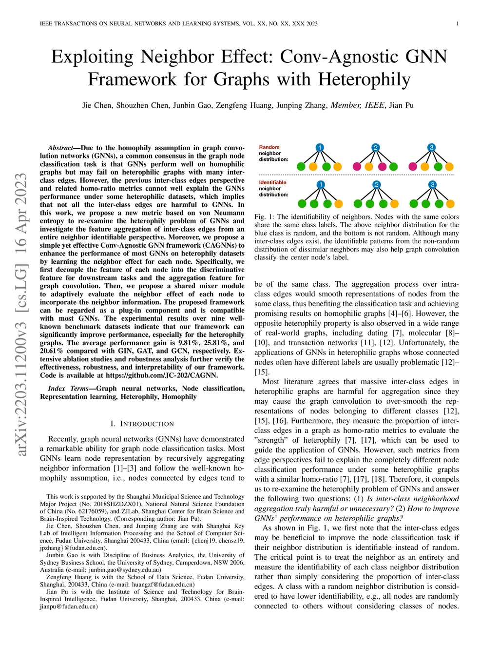 Due to the homophily assumption in graph convolution networks (GNNs), a common consensus in the graph node classification task is that GNNs perform well on homophilic graphs but may fail on heterophilic graphs with many inter-class edges. However, the previous inter-class edges perspective and related homo-ratio metrics cannot well explain the GNNs performance under some heterophilic datasets, which implies that not all the inter-class edges are harmful to GNNs. In this work, we propose a new metric based on von Neumann entropy to re-examine the heterophily problem of GNNs and investigate the feature aggregation of inter-class edges from an entire neighbor identifiable perspective. Moreover, we propose a simple yet effective Conv-Agnostic GNN framework (CAGNNs) to enhance the performance of most GNNs on heterophily datasets by learning the neighbor effect for each node. Specifically, we first decouple the feature of each node into the discriminative feature for downstream tasks and the aggregation feature for graph convolution. Then, we propose a shared mixer module to adaptively evaluate the neighbor effect of each node to incorporate the neighbor information. The proposed framework can be regarded as a plug-in component and is compatible with most GNNs. The experimental results over nine well-known benchmark datasets indicate that our framework can significantly improve performance, especially for the heterophily graphs. The average performance gain is 9.81%, 25.81%, and 20.61% compared with GIN, GAT, and GCN, respectively. Extensive ablation studies and robustness analysis further verify the effectiveness, robustness, and interpretability of our framework. Code is available at https://github.com/JC-202/CAGNN.