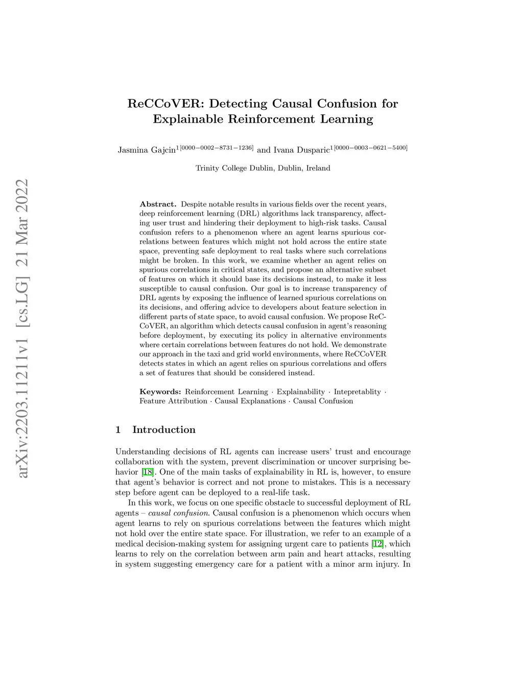 Despite notable results in various fields over the recent years, deep reinforcement learning (DRL) algorithms lack transparency, affecting user trust and hindering their deployment to high-risk tasks. Causal confusion refers to a phenomenon where an agent learns spurious correlations between features which might not hold across the entire state space, preventing safe deployment to real tasks where such correlations might be broken. In this work, we examine whether an agent relies on spurious correlations in critical states, and propose an alternative subset of features on which it should base its decisions instead, to make it less susceptible to causal confusion. Our goal is to increase transparency of DRL agents by exposing the influence of learned spurious correlations on its decisions, and offering advice to developers about feature selection in different parts of state space, to avoid causal confusion. We propose ReCCoVER, an algorithm which detects causal confusion in agent's reasoning before deployment, by executing its policy in alternative environments where certain correlations between features do not hold. We demonstrate our approach in taxi and grid world environments, where ReCCoVER detects states in which an agent relies on spurious correlations and offers a set of features that should be considered instead.