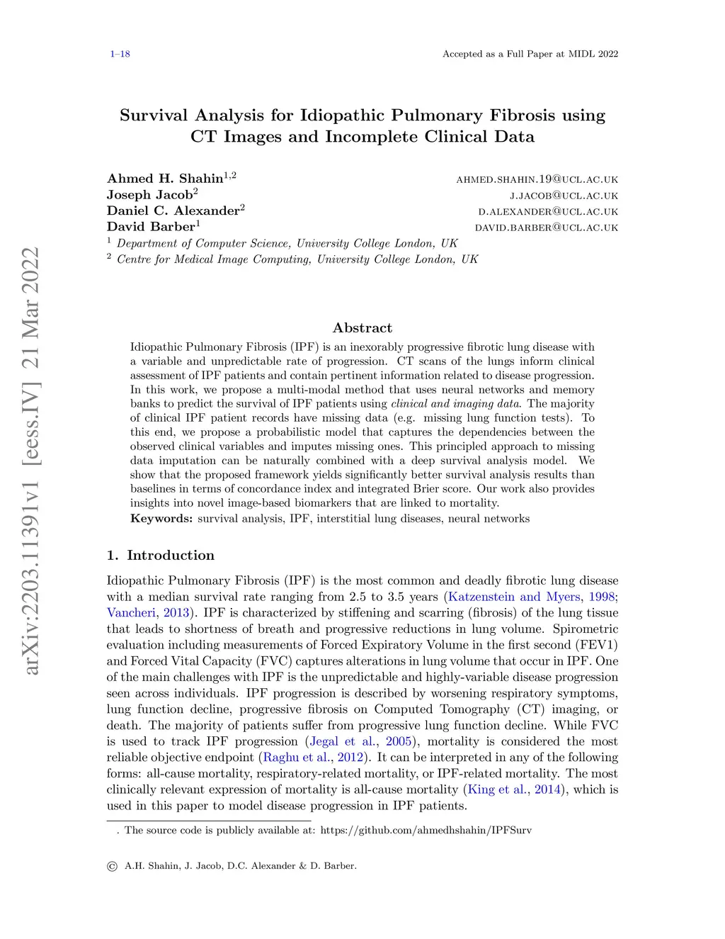 Idiopathic Pulmonary Fibrosis (IPF) is an inexorably progressive fibrotic lung disease with a variable and unpredictable rate of progression. CT scans of the lungs inform clinical assessment of IPF patients and contain pertinent information related to disease progression. In this work, we propose a multi-modal method that uses neural networks and memory banks to predict the survival of IPF patients using clinical and imaging data. The majority of clinical IPF patient records have missing data (e.g. missing lung function tests). To this end, we propose a probabilistic model that captures the dependencies between the observed clinical variables and imputes missing ones. This principled approach to missing data imputation can be naturally combined with a deep survival analysis model. We show that the proposed framework yields significantly better survival analysis results than baselines in terms of concordance index and integrated Brier score. Our work also provides insights into novel image-based biomarkers that are linked to mortality.
