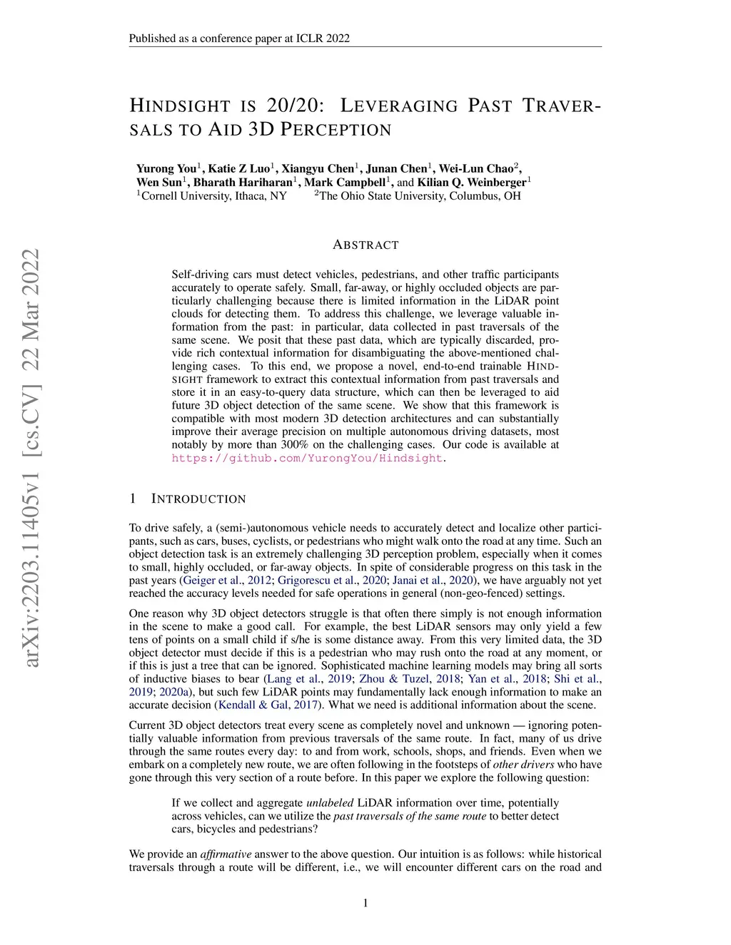 Self-driving cars must detect vehicles, pedestrians, and other traffic participants accurately to operate safely. Small, far-away, or highly occluded objects are particularly challenging because there is limited information in the LiDAR point clouds for detecting them. To address this challenge, we leverage valuable information from the past: in particular, data collected in past traversals of the same scene. We posit that these past data, which are typically discarded, provide rich contextual information for disambiguating the above-mentioned challenging cases. To this end, we propose a novel, end-to-end trainable Hindsight framework to extract this contextual information from past traversals and store it in an easy-to-query data structure, which can then be leveraged to aid future 3D object detection of the same scene. We show that this framework is compatible with most modern 3D detection architectures and can substantially improve their average precision on multiple autonomous driving datasets, most notably by more than 300% on the challenging cases.