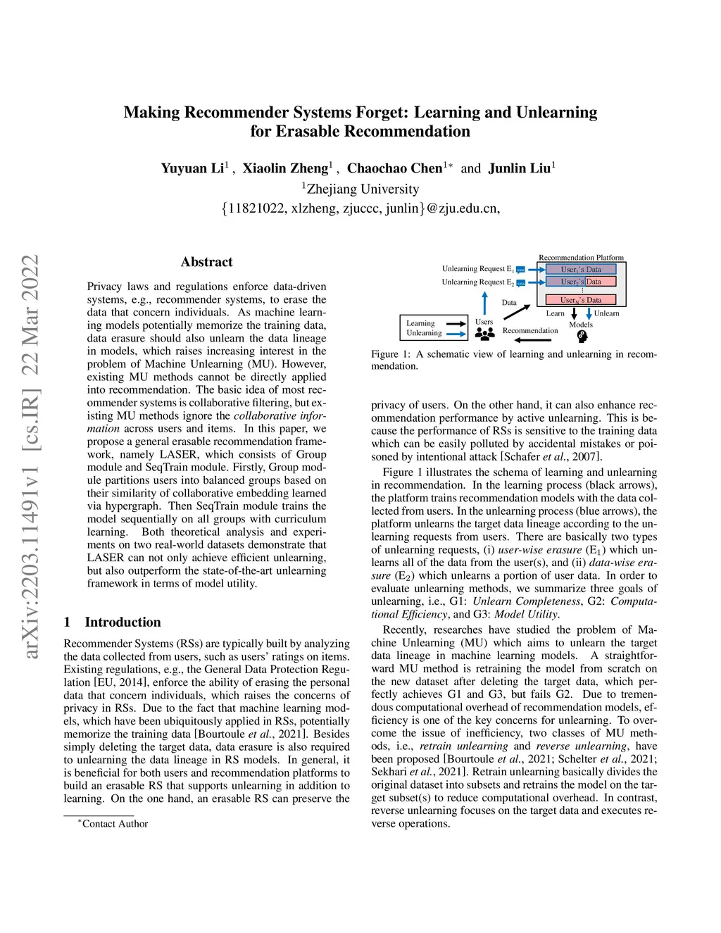Privacy laws and regulations enforce data-driven systems, e.g., recommender systems, to erase the data that concern individuals. As machine learning models potentially memorize the training data, data erasure should also unlearn the data lineage in models, which raises increasing interest in the problem of Machine Unlearning (MU). However, existing MU methods cannot be directly applied into recommendation. The basic idea of most recommender systems is collaborative filtering, but existing MU methods ignore the collaborative information across users and items. In this paper, we propose a general erasable recommendation framework, namely LASER, which consists of Group module and SeqTrain module. Firstly, Group module partitions users into balanced groups based on their similarity of collaborative embedding learned via hypergraph. Then SeqTrain module trains the model sequentially on all groups with curriculum learning. Both theoretical analysis and experiments on two real-world datasets demonstrate that LASER can not only achieve efficient unlearning, but also outperform the state-of-the-art unlearning framework in terms of model utility.