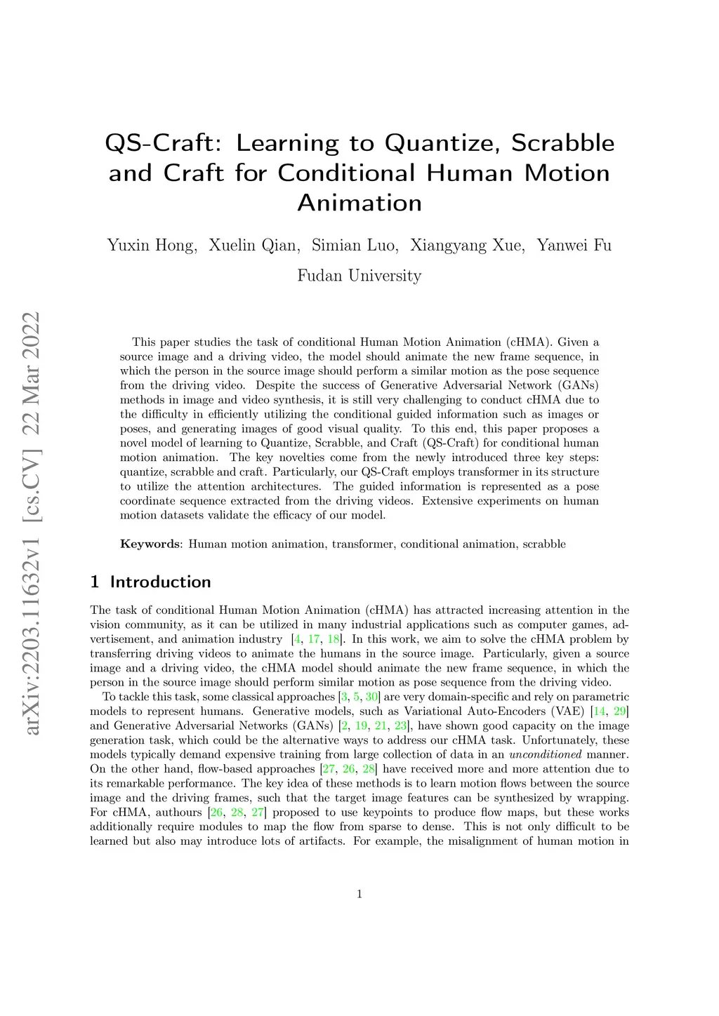 This paper studies the task of conditional Human Motion Animation (cHMA). Given a source image and a driving video, the model should animate the new frame sequence, in which the person in the source image should perform a similar motion as the pose sequence from the driving video. Despite the success of Generative Adversarial Network (GANs) methods in image and video synthesis, it is still very challenging to conduct cHMA due to the difficulty in efficiently utilizing the conditional guided information such as images or poses, and generating images of good visual quality. To this end, this paper proposes a novel model of learning to Quantize, Scrabble, and Craft (QS-Craft) for conditional human motion animation. The key novelties come from the newly introduced three key steps: quantize, scrabble and craft. Particularly, our QS-Craft employs transformer in its structure to utilize the attention architectures. The guided information is represented as a pose coordinate sequence extracted from the driving videos. Extensive experiments on human motion datasets validate the efficacy of our model.