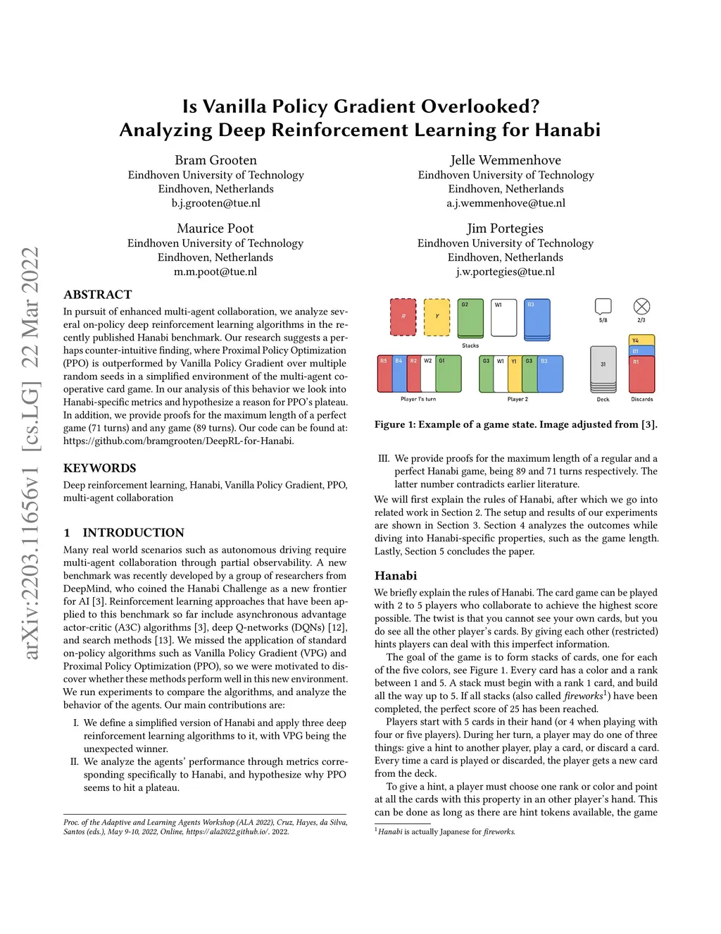 In pursuit of enhanced multi-agent collaboration, we analyze several on-policy deep reinforcement learning algorithms in the recently published Hanabi benchmark. Our research suggests a perhaps counter-intuitive finding, where Proximal Policy Optimization (PPO) is outperformed by Vanilla Policy Gradient over multiple random seeds in a simplified environment of the multi-agent cooperative card game. In our analysis of this behavior we look into Hanabi-specific metrics and hypothesize a reason for PPO's plateau. In addition, we provide proofs for the maximum length of a perfect game (71 turns) and any game (89 turns). Our code can be found at: https://github.com/bramgrooten/DeepRL-for-Hanabi