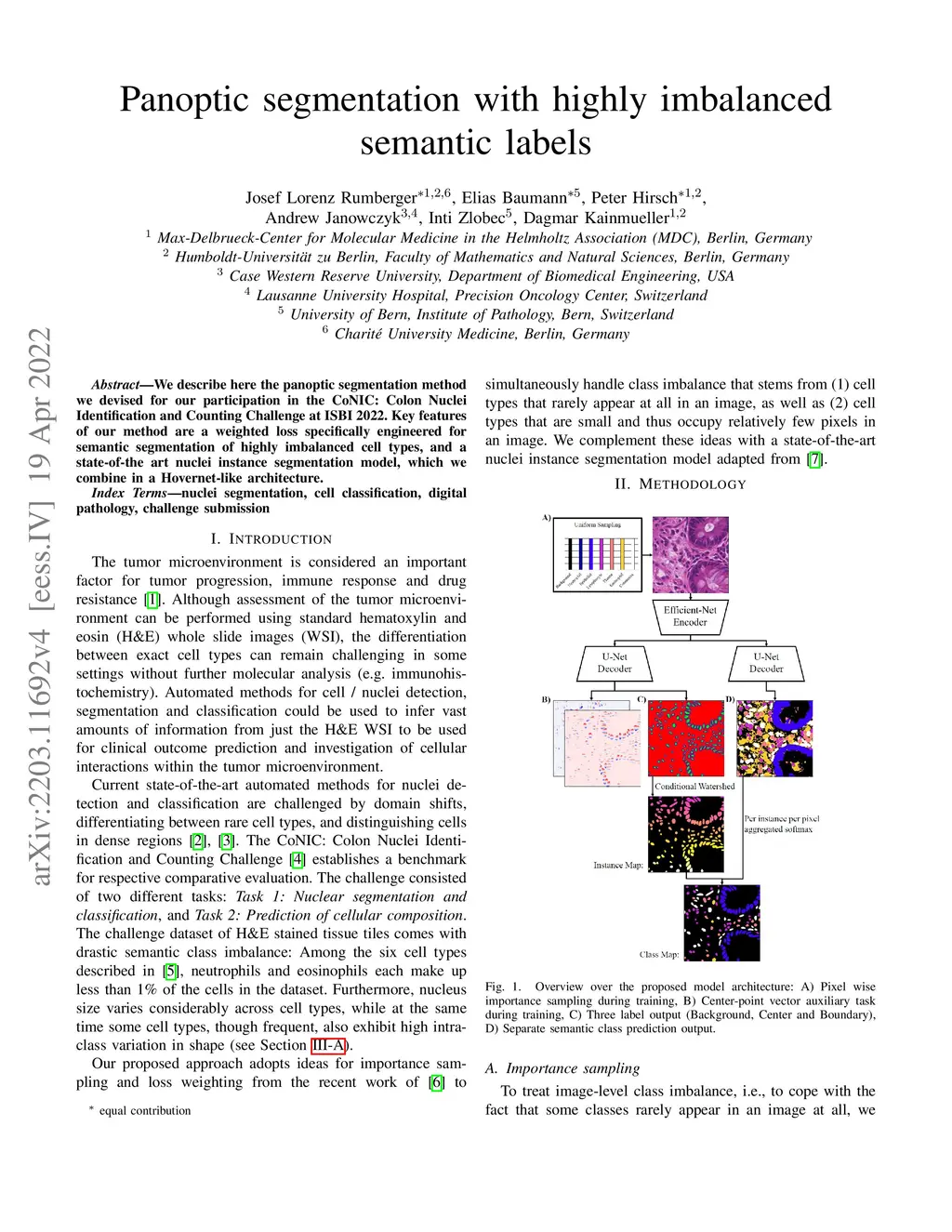 We describe here the panoptic segmentation method we devised for our participation in the CoNIC: Colon Nuclei Identification and Counting Challenge at ISBI 2022. Key features of our method are a weighted loss specifically engineered for semantic segmentation of highly imbalanced cell types, and a state-of-the art nuclei instance segmentation model, which we combine in a Hovernet-like architecture.