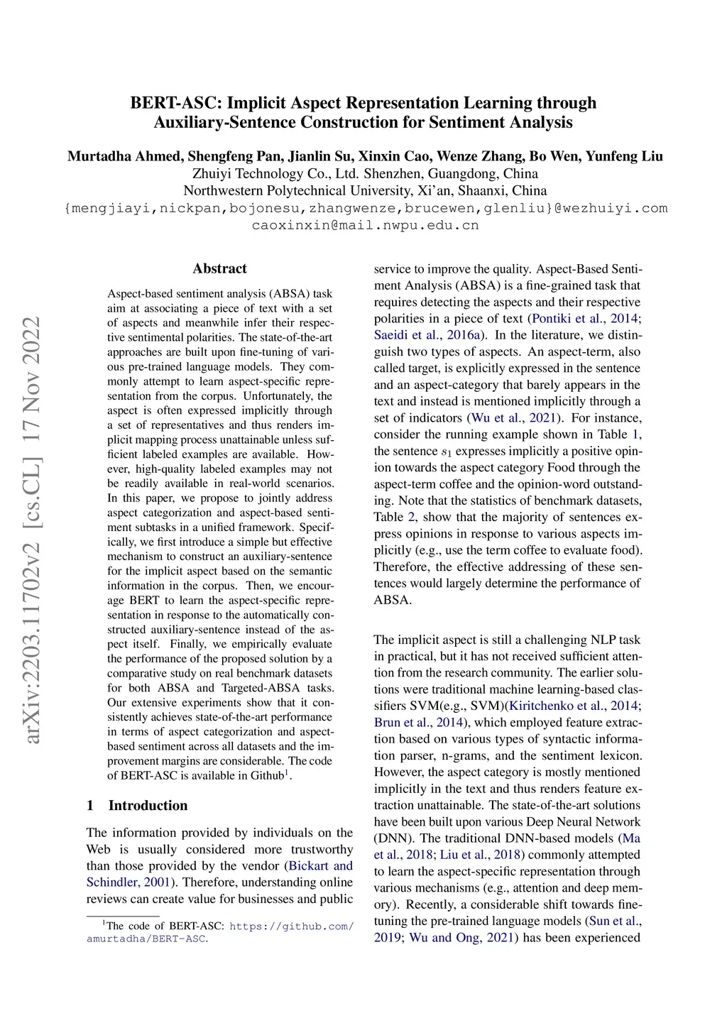 BERT-ASC: Implicit Aspect Representation Learning through