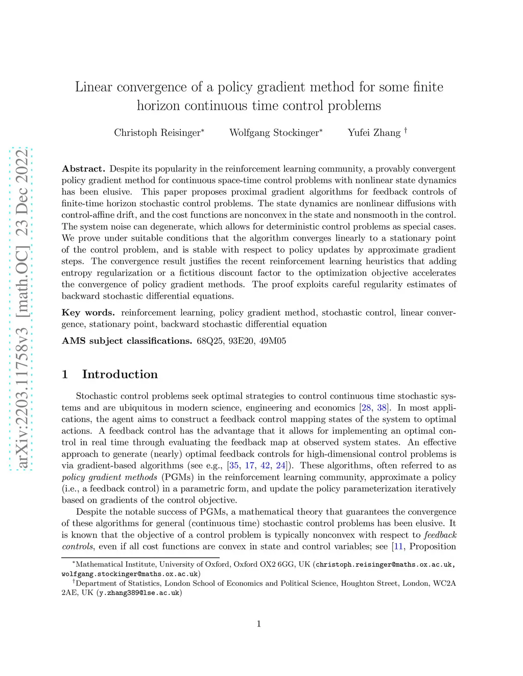 Despite its popularity in the reinforcement learning community, a provably convergent policy gradient method for continuous space-time control problems with nonlinear state dynamics has been elusive. This paper proposes proximal gradient algorithms for feedback controls of finite-time horizon stochastic control problems. The state dynamics are nonlinear diffusions with control-affine drift, and the cost functions are nonconvex in the state and nonsmooth in the control. The system noise can degenerate, which allows for deterministic control problems as special cases. We prove under suitable conditions that the algorithm converges linearly to a stationary point of the control problem, and is stable with respect to policy updates by approximate gradient steps. The convergence result justifies the recent reinforcement learning heuristics that adding entropy regularization or a fictitious discount factor to the optimization objective accelerates the convergence of policy gradient methods. The proof exploits careful regularity estimates of backward stochastic differential equations.