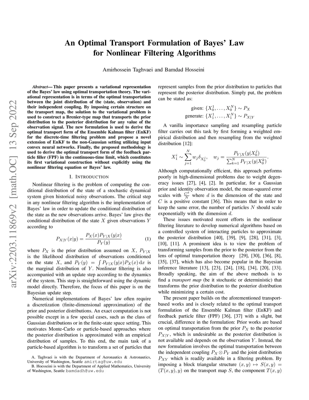 This paper presents a variational representation of the Bayes' law using optimal transportation theory. The variational representation is in terms of the optimal transportation between the joint distribution of the (state, observation) and their independent coupling. By imposing certain structure on the transport map, the solution to the variational problem is used to construct a Brenier-type map that transports the prior distribution to the posterior distribution for any value of the observation signal. The new formulation is used to derive the optimal transport form of the Ensemble Kalman filter (EnKF) for the discrete-time filtering problem and propose a novel extension of EnKF to the non-Gaussian setting utilizing input convex neural networks. Finally, the proposed methodology is used to derive the optimal transport form of the feedback particle filler (FPF) in the continuous-time limit, which constitutes its first variational construction without explicitly using the nonlinear filtering equation or Bayes' law.