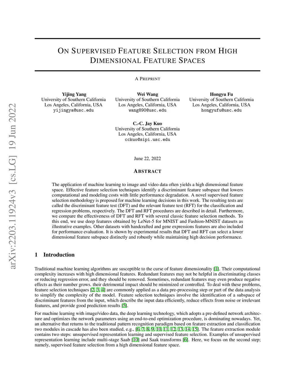 The application of machine learning to image and video data often yields a high dimensional feature space. Effective feature selection techniques identify a discriminant feature subspace that lowers computational and modeling costs with little performance degradation. A novel supervised feature selection methodology is proposed for machine learning decisions in this work. The resulting tests are called the discriminant feature test (DFT) and the relevant feature test (RFT) for the classification and regression problems, respectively. The DFT and RFT procedures are described in detail. Furthermore, we compare the effectiveness of DFT and RFT with several classic feature selection methods. To this end, we use deep features obtained by LeNet-5 for MNIST and Fashion-MNIST datasets as illustrative examples. Other datasets with handcrafted and gene expressions features are also included for performance evaluation. It is shown by experimental results that DFT and RFT can select a lower dimensional feature subspace distinctly and robustly while maintaining high decision performance.