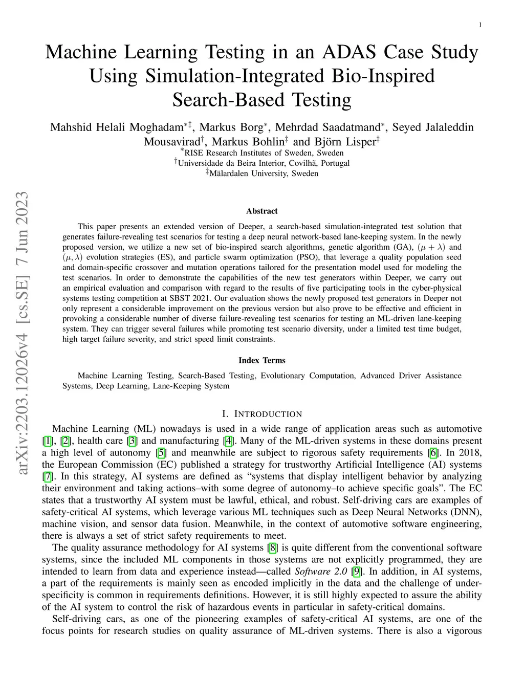 This paper presents an extended version of Deeper, a search-based simulation-integrated test solution that generates failure-revealing test scenarios for testing a deep neural network-based lane-keeping system. In the newly proposed version, we utilize a new set of bio-inspired search algorithms, genetic algorithm (GA), and evolution strategies (ES), and particle swarm optimization (PSO), that leverage a quality population seed and domain-specific cross-over and mutation operations tailored for the presentation model used for modeling the test scenarios. In order to demonstrate the capabilities of the new test generators within Deeper, we carry out an empirical evaluation and comparison with regard to the results of five participating tools in the cyber-physical systems testing competition at SBST 2021. Our evaluation shows the newly proposed test generators in Deeper not only represent a considerable improvement on the previous version but also prove to be effective and efficient in provoking a considerable number of diverse failure-revealing test scenarios for testing an ML-driven lane-keeping system. They can trigger several failures while promoting test scenario diversity, under a limited test time budget, high target failure severity, and strict speed limit constraints.
