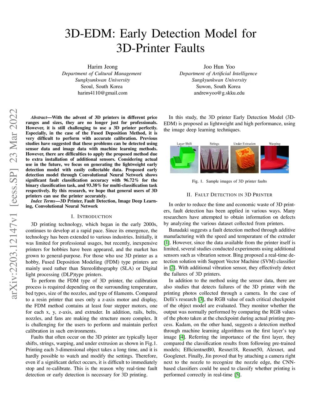 With the advent of 3D printers in different price ranges and sizes, they are no longer just for professionals. However, it is still challenging to use a 3D printer perfectly. Especially, in the case of the Fused Deposition Method, it is very difficult to perform with accurate calibration. Previous studies have suggested that these problems can be detected using sensor data and image data with machine learning methods. However, there are difficulties to apply the proposed method due to extra installation of additional sensors. Considering actual use in the future, we focus on generating the lightweight early detection model with easily collectable data. Proposed early detection model through Convolutional Neural Network shows significant fault classification accuracy with 96.72% for the binary classification task, and 93.38% for multi-classification task respectively. By this research, we hope that general users of 3D printers can use the printer accurately.