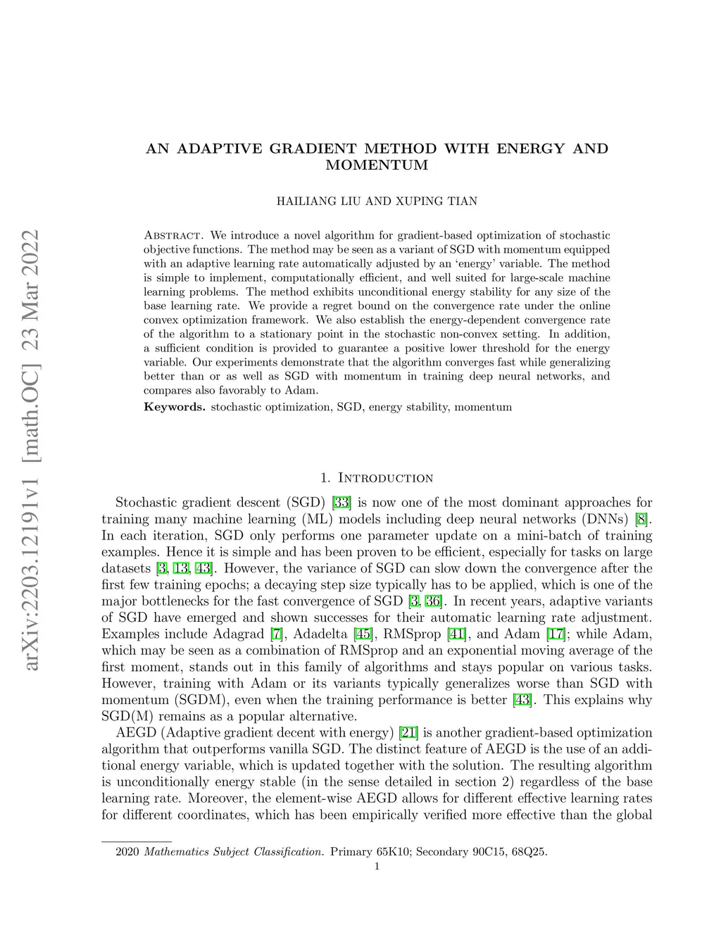 We introduce a novel algorithm for gradient-based optimization of stochastic objective functions. The method may be seen as a variant of SGD with momentum equipped with an adaptive learning rate automatically adjusted by an énergy' variable. The method is simple to implement, computationally efficient, and well suited for large-scale machine learning problems. The method exhibits unconditional energy stability for any size of the base learning rate. We provide a regret bound on the convergence rate under the online convex optimization framework. We also establish the energy-dependent convergence rate of the algorithm to a stationary point in the stochastic non-convex setting. In addition, a sufficient condition is provided to guarantee a positive lower threshold for the energy variable. Our experiments demonstrate that the algorithm converges fast while generalizing better than or as well as SGD with momentum in training deep neural networks, and compares also favorably to Adam.