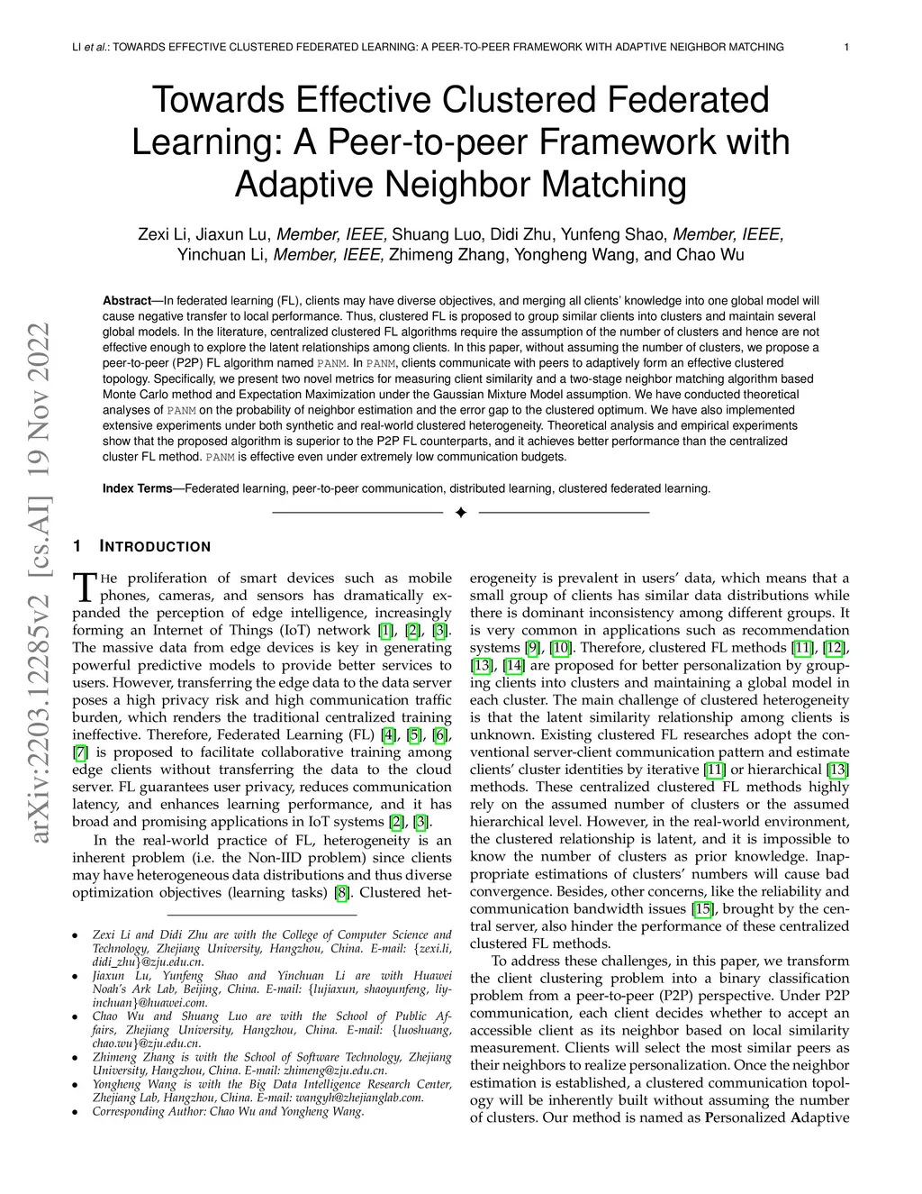 In federated learning (FL), clients may have diverse objectives, and merging all clients' knowledge into one global model will cause negative transfer to local performance. Thus, clustered FL is proposed to group similar clients into clusters and maintain several global models. In the literature, centralized clustered FL algorithms require the assumption of the number of clusters and hence are not effective enough to explore the latent relationships among clients. In this paper, without assuming the number of clusters, we propose a peer-to-peer (P2P) FL algorithm named PANM. In PANM, clients communicate with peers to adaptively form an effective clustered topology. Specifically, we present two novel metrics for measuring client similarity and a two-stage neighbor matching algorithm based Monte Carlo method and Expectation Maximization under the Gaussian Mixture Model assumption. We have conducted theoretical analyses of PANM on the probability of neighbor estimation and the error gap to the clustered optimum. We have also implemented extensive experiments under both synthetic and real-world clustered heterogeneity. Theoretical analysis and empirical experiments show that the proposed algorithm is superior to the P2P FL counterparts, and it achieves better performance than the centralized cluster FL method. PANM is effective even under extremely low communication budgets.