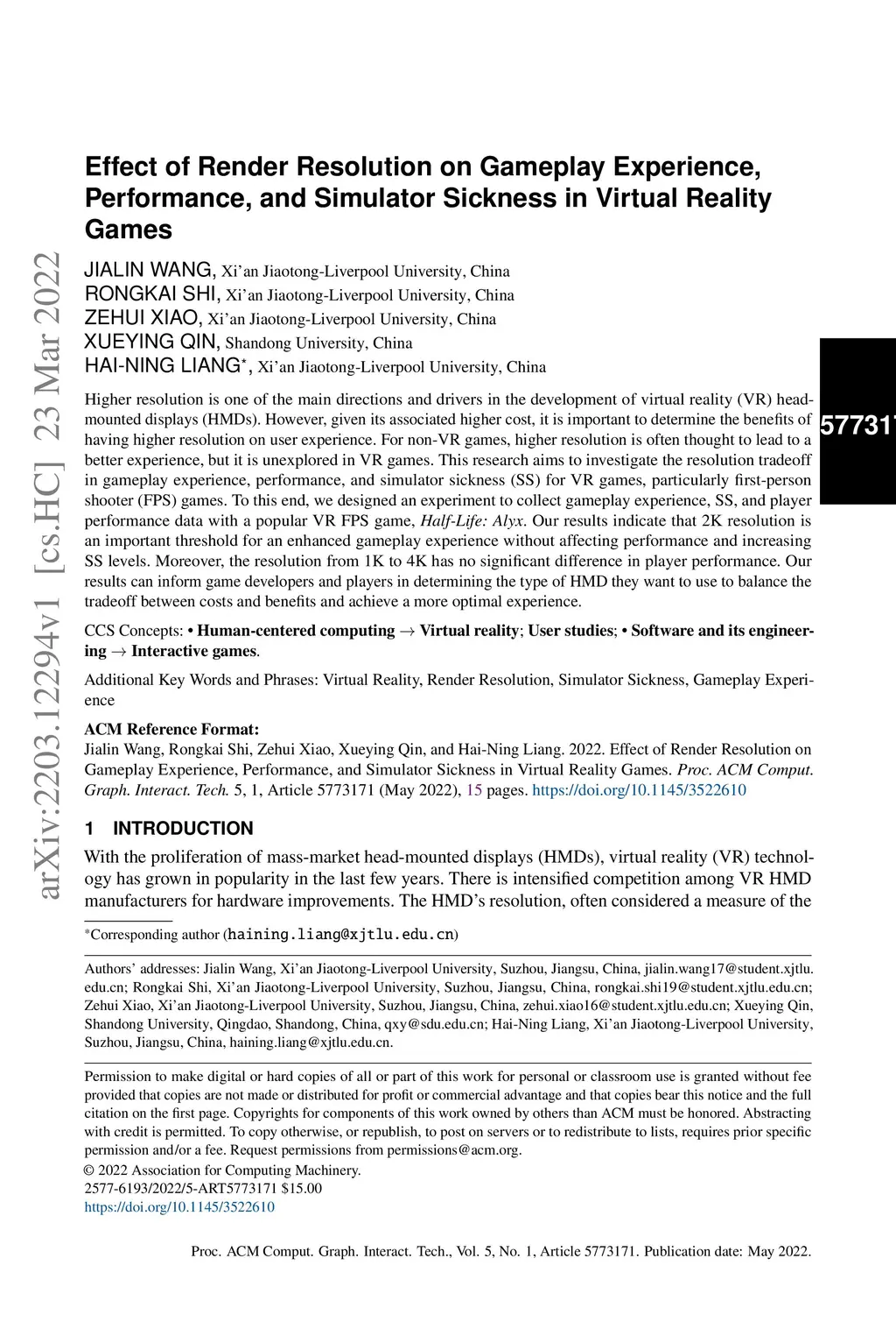 Effect of Render Resolution on Gameplay Experience, Performance, and