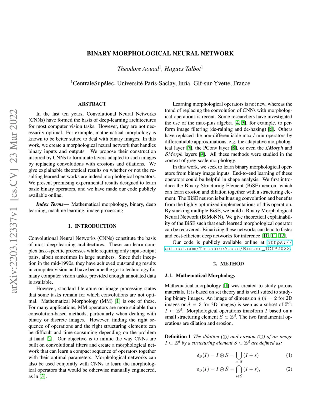 In the last ten years, Convolutional Neural Networks (CNNs) have formed the basis of deep-learning architectures for most computer vision tasks. However, they are not necessarily optimal. For example, mathematical morphology is known to be better suited to deal with binary images. In this work, we create a morphological neural network that handles binary inputs and outputs. We propose their construction inspired by CNNs to formulate layers adapted to such images by replacing convolutions with erosions and dilations. We give explainable theoretical results on whether or not the resulting learned networks are indeed morphological operators. We present promising experimental results designed to learn basic binary operators, and we have made our code publicly available online.