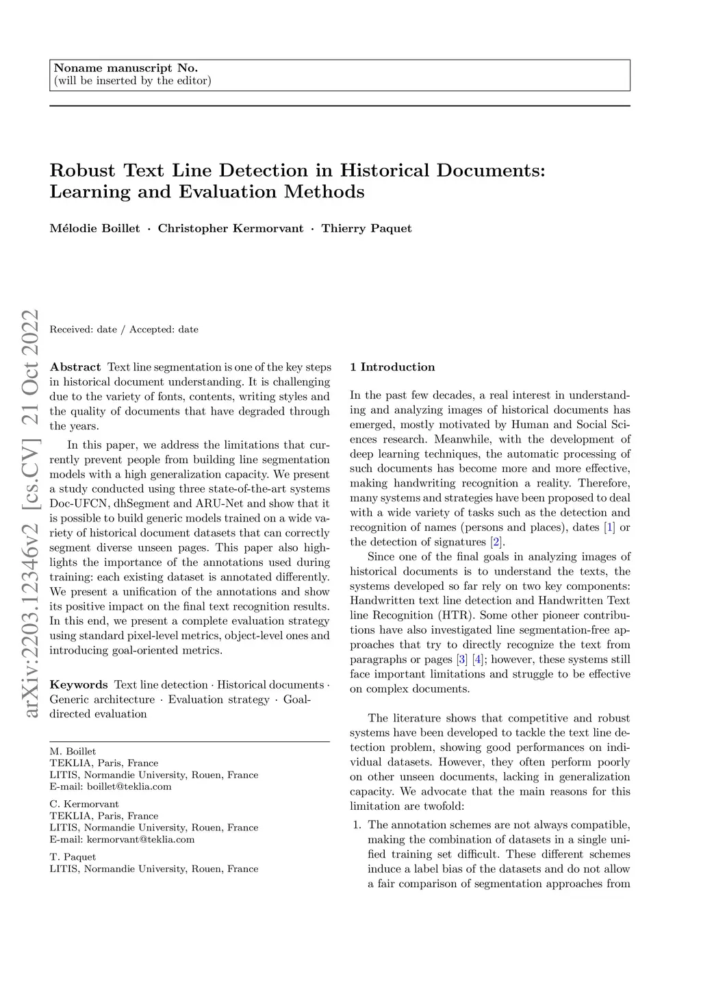 Robust Text Line Detection in Historical Documents: Learning and