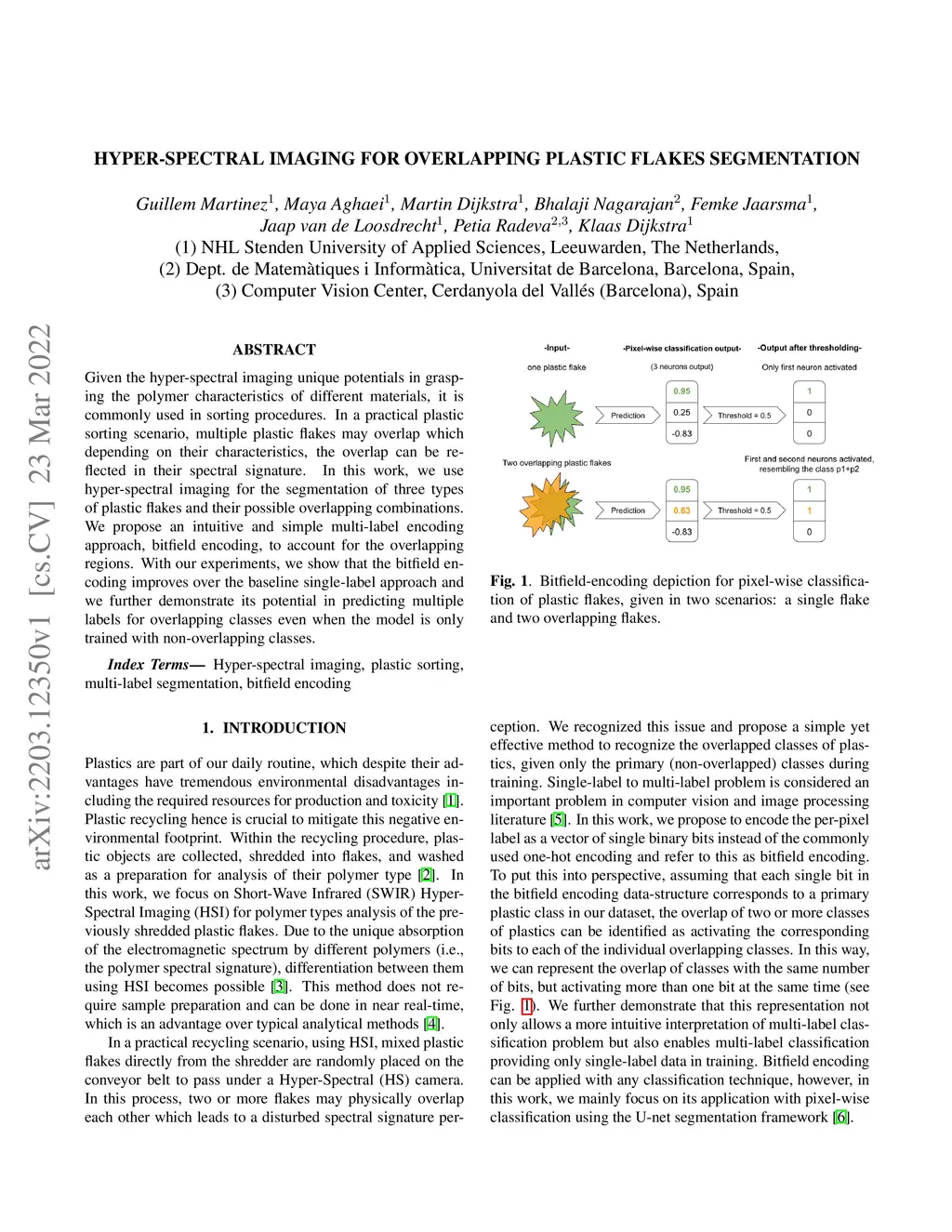 Given the hyper-spectral imaging unique potentials in grasping the polymer characteristics of different materials, it is commonly used in sorting procedures. In a practical plastic sorting scenario, multiple plastic flakes may overlap which depending on their characteristics, the overlap can be reflected in their spectral signature. In this work, we use hyper-spectral imaging for the segmentation of three types of plastic flakes and their possible overlapping combinations. We propose an intuitive and simple multi-label encoding approach, bitfield encoding, to account for the overlapping regions. With our experiments, we show that the bitfield encoding improves over the baseline single-label approach and we further demonstrate its potential in predicting multiple labels for overlapping classes even when the model is only trained with non-overlapping classes.