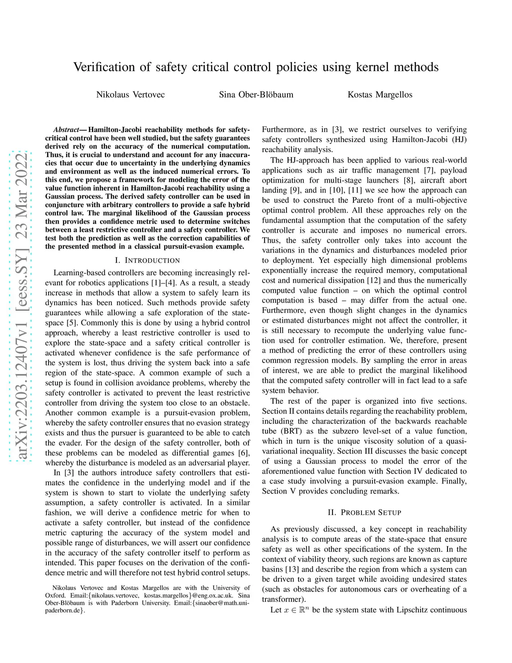 Verification of safety critical control policies using kernel methods