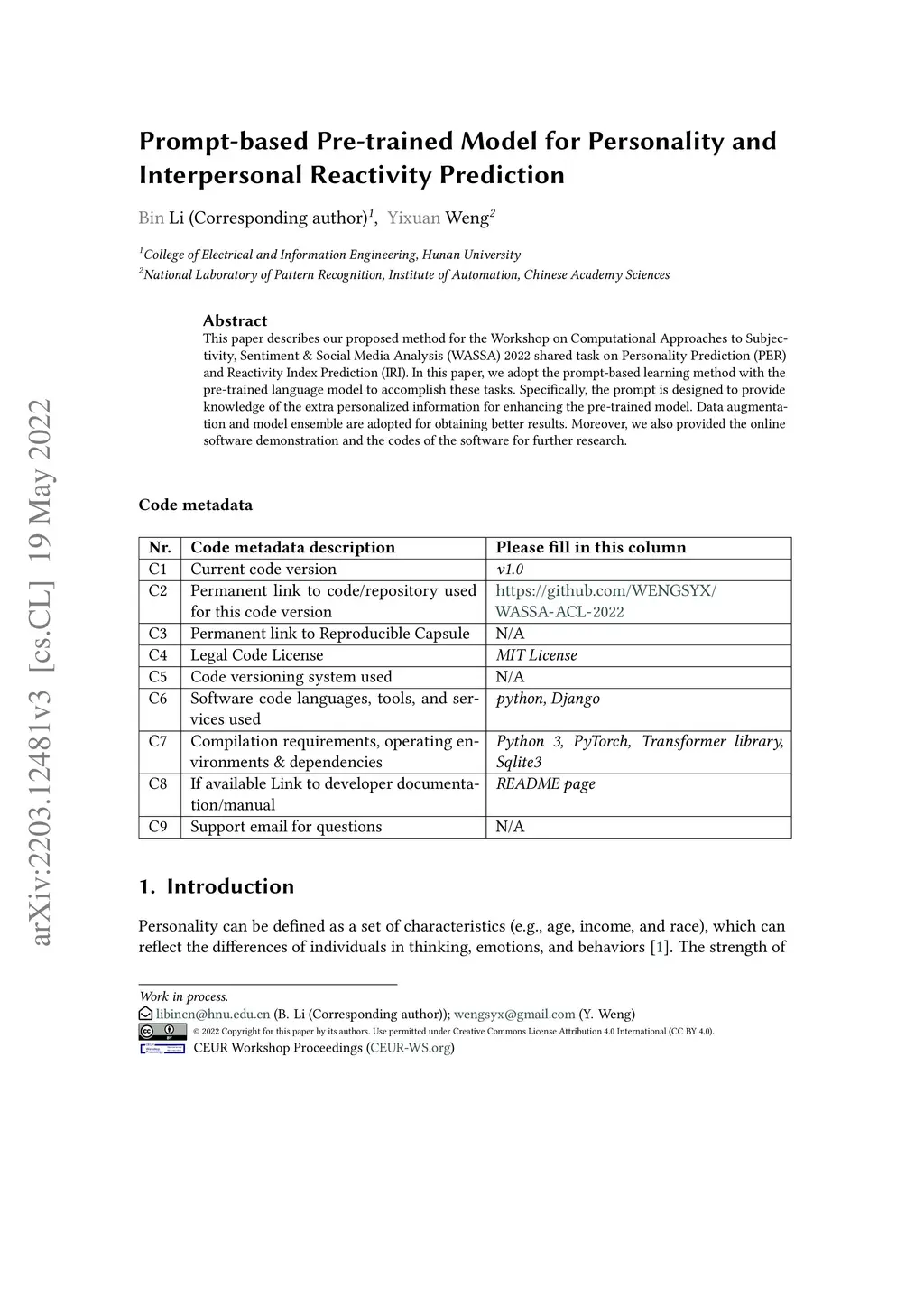 This paper describes our proposed method for the Workshop on Computational Approaches to Subjectivity, Sentiment & Social Media Analysis (WASSA) 2022 shared task on Personality Prediction (PER) and Reactivity Index Prediction (IRI). In this paper, we adopt the prompt-based learning method with the pre-trained language model to accomplish these tasks. Specifically, the prompt is designed to provide knowledge of the extra personalized information for enhancing the pre-trained model. Data augmentation and model ensemble are adopted for obtaining better results. Moreover, we also provided the online software demonstration and the codes of the software for further research.
