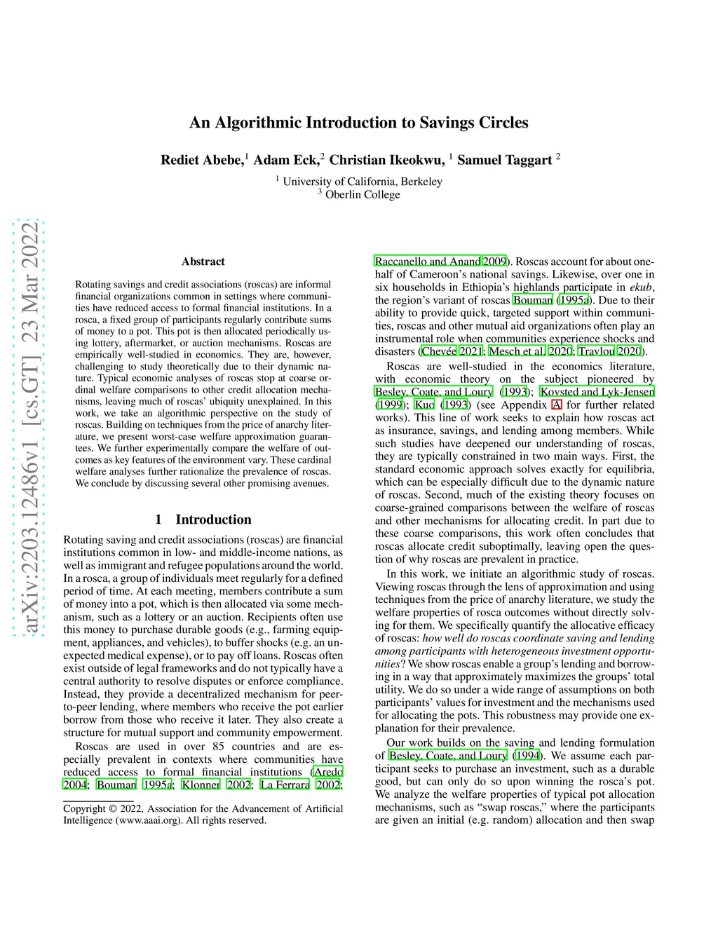 Rotating savings and credit associations (roscas) are informal financial organizations common in settings where communities have reduced access to formal financial institutions. In a rosca, a fixed group of participants regularly contribute sums of money to a pot. This pot is then allocated periodically using lottery, aftermarket, or auction mechanisms. Roscas are empirically well-studied in economics. They are, however, challenging to study theoretically due to their dynamic nature. Typical economic analyses of roscas stop at coarse ordinal welfare comparisons to other credit allocation mechanisms, leaving much of roscas' ubiquity unexplained. In this work, we take an algorithmic perspective on the study of roscas. Building on techniques from the price of anarchy literature, we present worst-case welfare approximation guarantees. We further experimentally compare the welfare of outcomes as key features of the environment vary. These cardinal welfare analyses further rationalize the prevalence of roscas. We conclude by discussing several other promising avenues.
