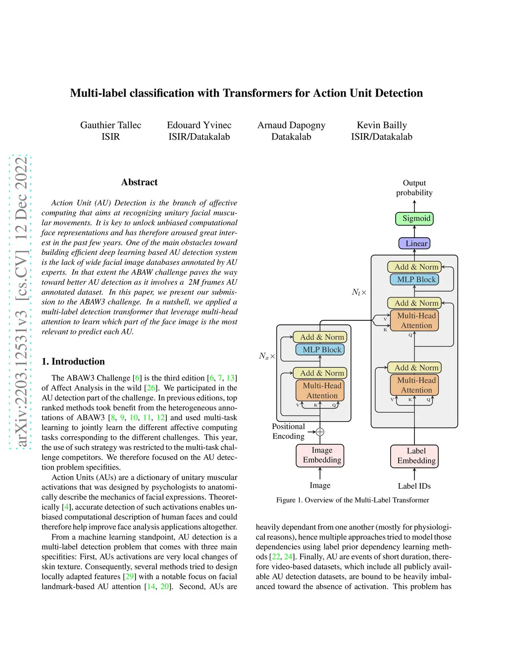 Action Unit (AU) Detection is the branch of affective computing that aims at recognizing unitary facial muscular movements. It is key to unlock unbiased computational face representations and has therefore aroused great interest in the past few years. One of the main obstacles toward building efficient deep learning based AU detection system is the lack of wide facial image databases annotated by AU experts. In that extent the ABAW challenge paves the way toward better AU detection as it involves a 2M frames AU annotated dataset. In this paper, we present our submission to the ABAW3 challenge. In a nutshell, we applied a multi-label detection transformer that leverage multi-head attention to learn which part of the face image is the most relevant to predict each AU.