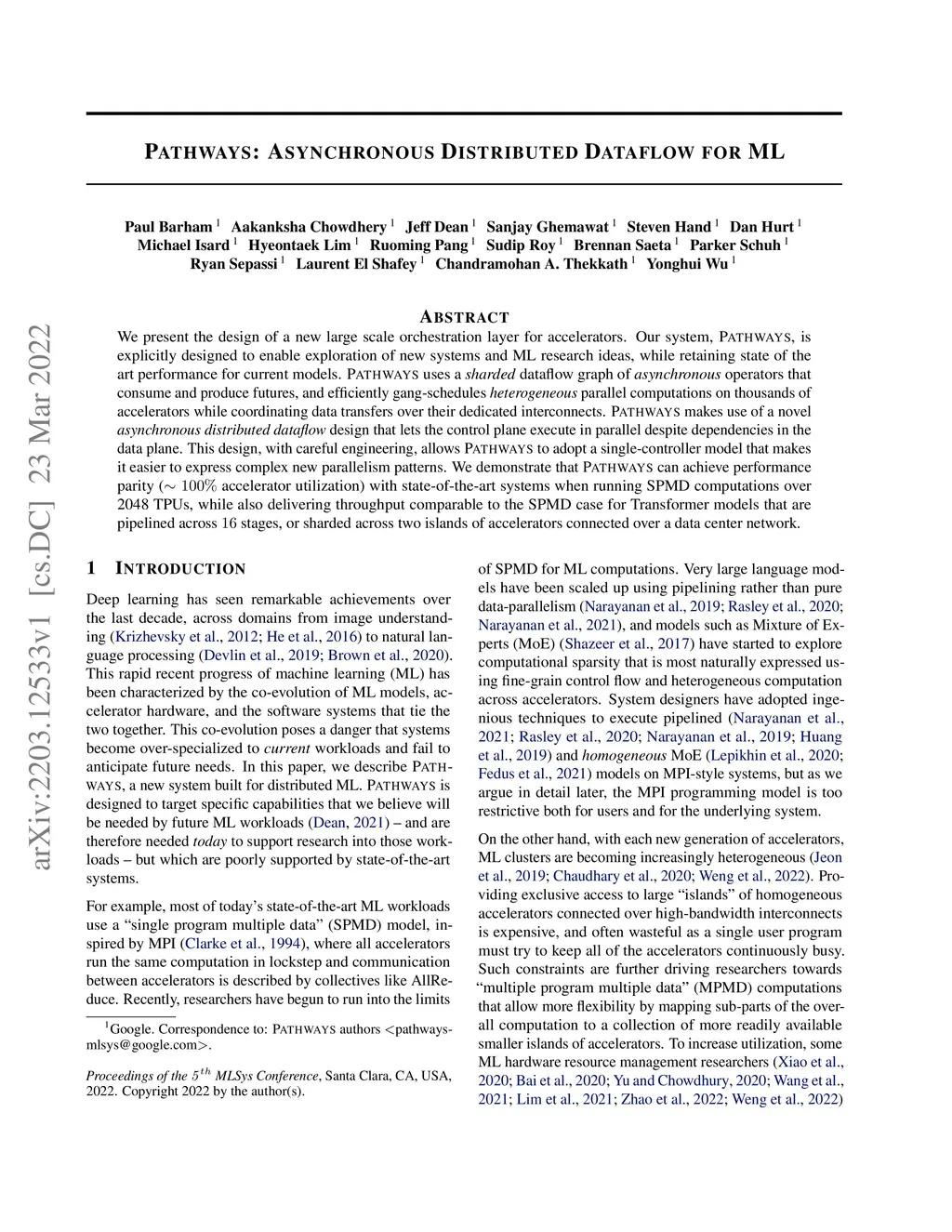 We present the design of a new large scale orchestration layer for accelerators. Our system, Pathways, is explicitly designed to enable exploration of new systems and ML research ideas, while retaining state of the art performance for current models. Pathways uses a sharded dataflow graph of asynchronous operators that consume and produce futures, and efficiently gang-schedules heterogeneous parallel computations on thousands of accelerators while coordinating data transfers over their dedicated interconnects. Pathways makes use of a novel asynchronous distributed dataflow design that lets the control plane execute in parallel despite dependencies in the data plane. This design, with careful engineering, allows Pathways to adopt a single-controller model that makes it easier to express complex new parallelism patterns. We demonstrate that Pathways can achieve performance parity (~100% accelerator utilization) with state-of-the-art systems when running SPMD computations over 2048 TPUs, while also delivering throughput comparable to the SPMD case for Transformer models that are pipelined across 16 stages, or sharded across two islands of accelerators connected over a data center network.