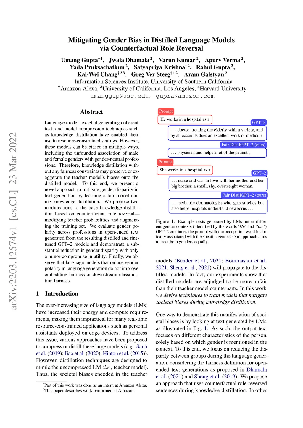 Language models excel at generating coherent text, and model compression techniques such as knowledge distillation have enabled their use in resource-constrained settings. However, these models can be biased in multiple ways, including the unfounded association of male and female genders with gender-neutral professions. Therefore, knowledge distillation without any fairness constraints may preserve or exaggerate the teacher model's biases onto the distilled model. To this end, we present a novel approach to mitigate gender disparity in text generation by learning a fair model during knowledge distillation. We propose two modifications to the base knowledge distillation based on counterfactual role reversalmodifying teacher probabilities and augmenting the training set. We evaluate gender polarity across professions in open-ended text generated from the resulting distilled and finetuned GPT2 models and demonstrate a substantial reduction in gender disparity with only a minor compromise in utility. Finally, we observe that language models that reduce gender polarity in language generation do not improve embedding fairness or downstream classification fairness.