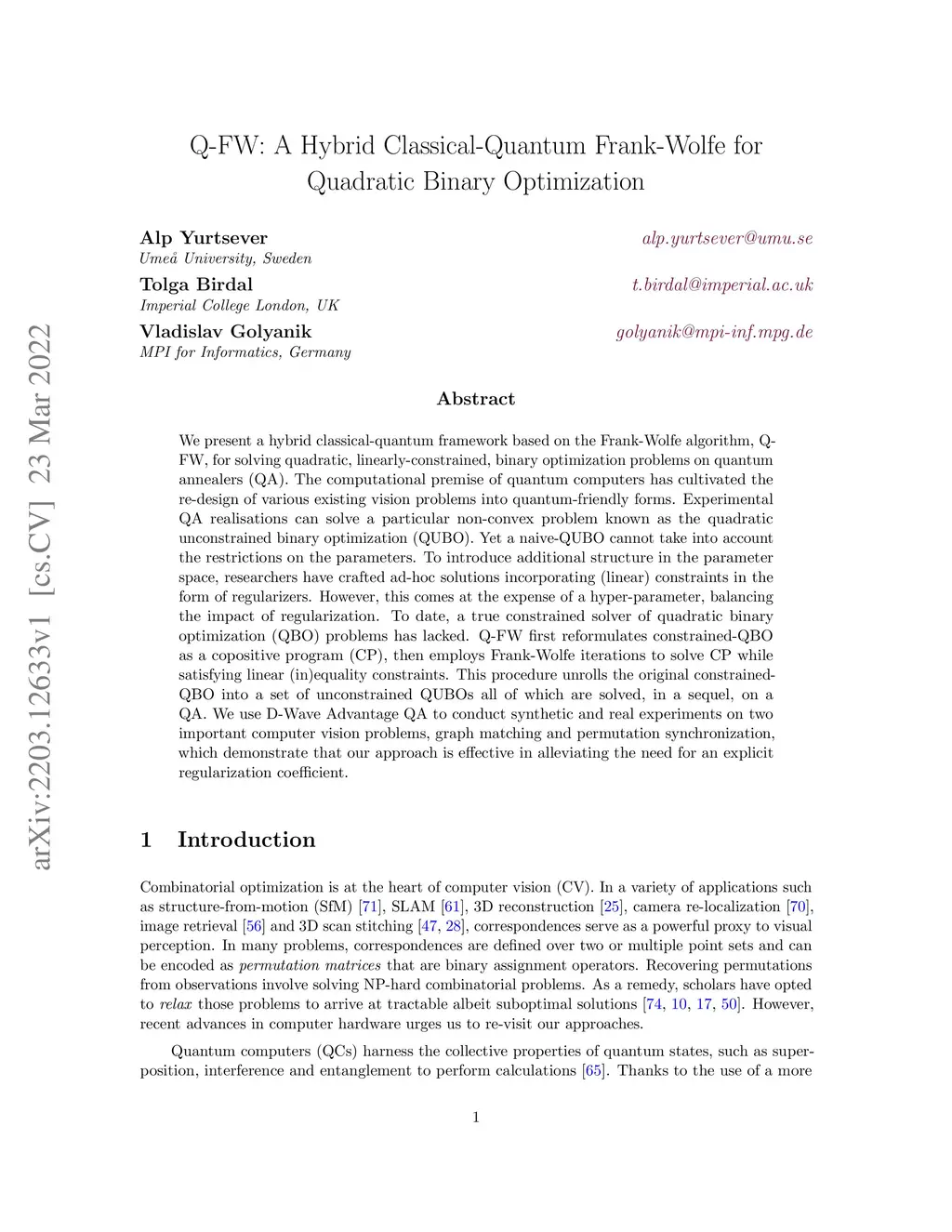 We present a hybrid classical-quantum framework based on the Frank-Wolfe algorithm, Q-FW, for solving quadratic, linearly-constrained, binary optimization problems on quantum annealers (QA). The computational premise of quantum computers has cultivated the re-design of various existing vision problems into quantum-friendly forms. Experimental QA realizations can solve a particular non-convex problem known as the quadratic unconstrained binary optimization (QUBO). Yet a naive-QUBO cannot take into account the restrictions on the parameters. To introduce additional structure in the parameter space, researchers have crafted ad-hoc solutions incorporating (linear) constraints in the form of regularizers. However, this comes at the expense of a hyper-parameter, balancing the impact of regularization. To date, a true constrained solver of quadratic binary optimization (QBO) problems has lacked. Q-FW first reformulates constrained-QBO as a copositive program (CP), then employs Frank-Wolfe iterations to solve CP while satisfying linear (in)equality constraints. This procedure unrolls the original constrained-QBO into a set of unconstrained QUBOs all of which are solved, in a sequel, on a QA. We use D-Wave Advantage QA to conduct synthetic and real experiments on two important computer vision problems, graph matching and permutation synchronization, which demonstrate that our approach is effective in alleviating the need for an explicit regularization coefficient.