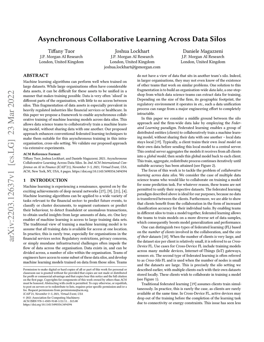 Machine learning algorithms can perform well when trained on large datasets. While large organisations often have considerable data assets, it can be difficult for these assets to be unified in a manner that makes training possible. Data is very often 'siloed' in different parts of the organisation, with little to no access between silos. This fragmentation of data assets is especially prevalent in heavily regulated industries like financial services or healthcare. In this paper we propose a framework to enable asynchronous collaborative training of machine learning models across data silos. This allows data science teams to collaboratively train a machine learning model, without sharing data with one another. Our proposed approach enhances conventional federated learning techniques to make them suitable for this asynchronous training in this intra-organisation, cross-silo setting. We validate our proposed approach via extensive experiments.
