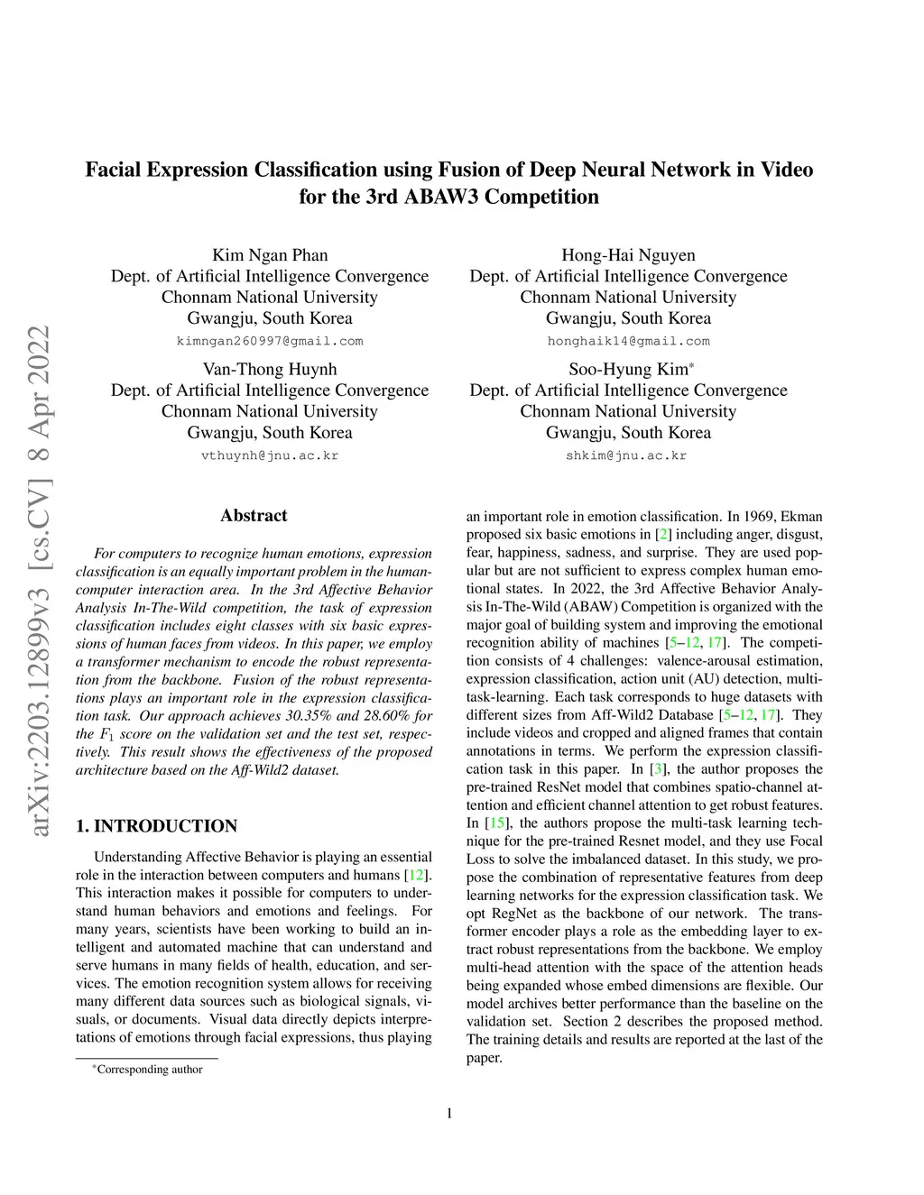 For computers to recognize human emotions, expression classification is an equally important problem in the human-computer interaction area. In the 3rd Affective Behavior Analysis In-The-Wild competition, the task of expression classification includes eight classes with six basic expressions of human faces from videos. In this paper, we employ a transformer mechanism to encode the robust representation from the backbone. Fusion of the robust representations plays an important role in the expression classification task. Our approach achieves 30.35\% and 28.60\% for the score on the validation set and the test set, respectively. This result shows the effectiveness of the proposed architecture based on the Aff-Wild2 dataset.