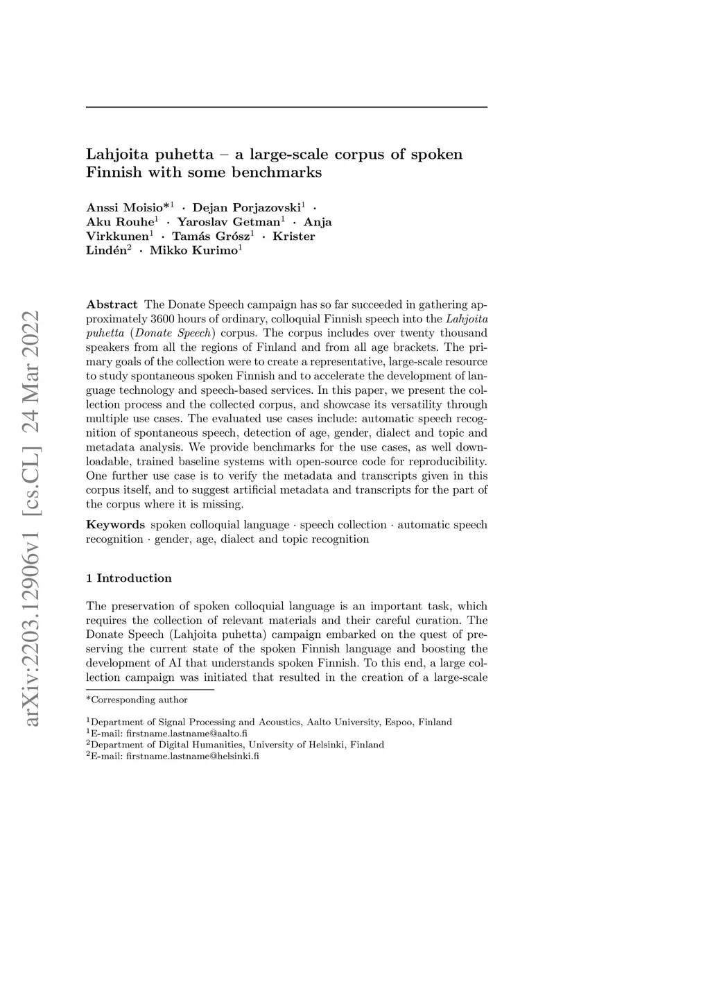 The Donate Speech campaign has so far succeeded in gathering approximately 3600 hours of ordinary, colloquial Finnish speech into the Lahjoita puhetta (Donate Speech) corpus. The corpus includes over twenty thousand speakers from all the regions of Finland and from all age brackets. The primary goals of the collection were to create a representative, large-scale resource to study spontaneous spoken Finnish and to accelerate the development of language technology and speech-based services. In this paper, we present the collection process and the collected corpus, and showcase its versatility through multiple use cases. The evaluated use cases include: automatic speech recognition of spontaneous speech, detection of age, gender, dialect and topic and metadata analysis. We provide benchmarks for the use cases, as well down loadable, trained baseline systems with open-source code for reproducibility. One further use case is to verify the metadata and transcripts given in this corpus itself, and to suggest artificial metadata and transcripts for the part of the corpus where it is missing.