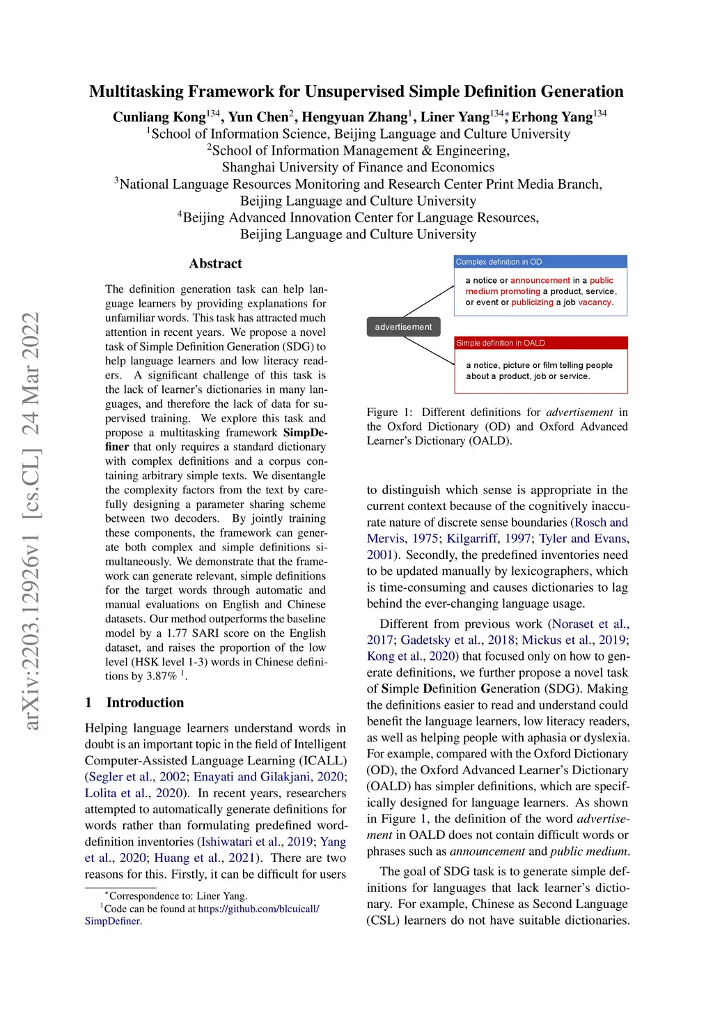 Multitasking Framework for Unsupervised Simple Definition Generation