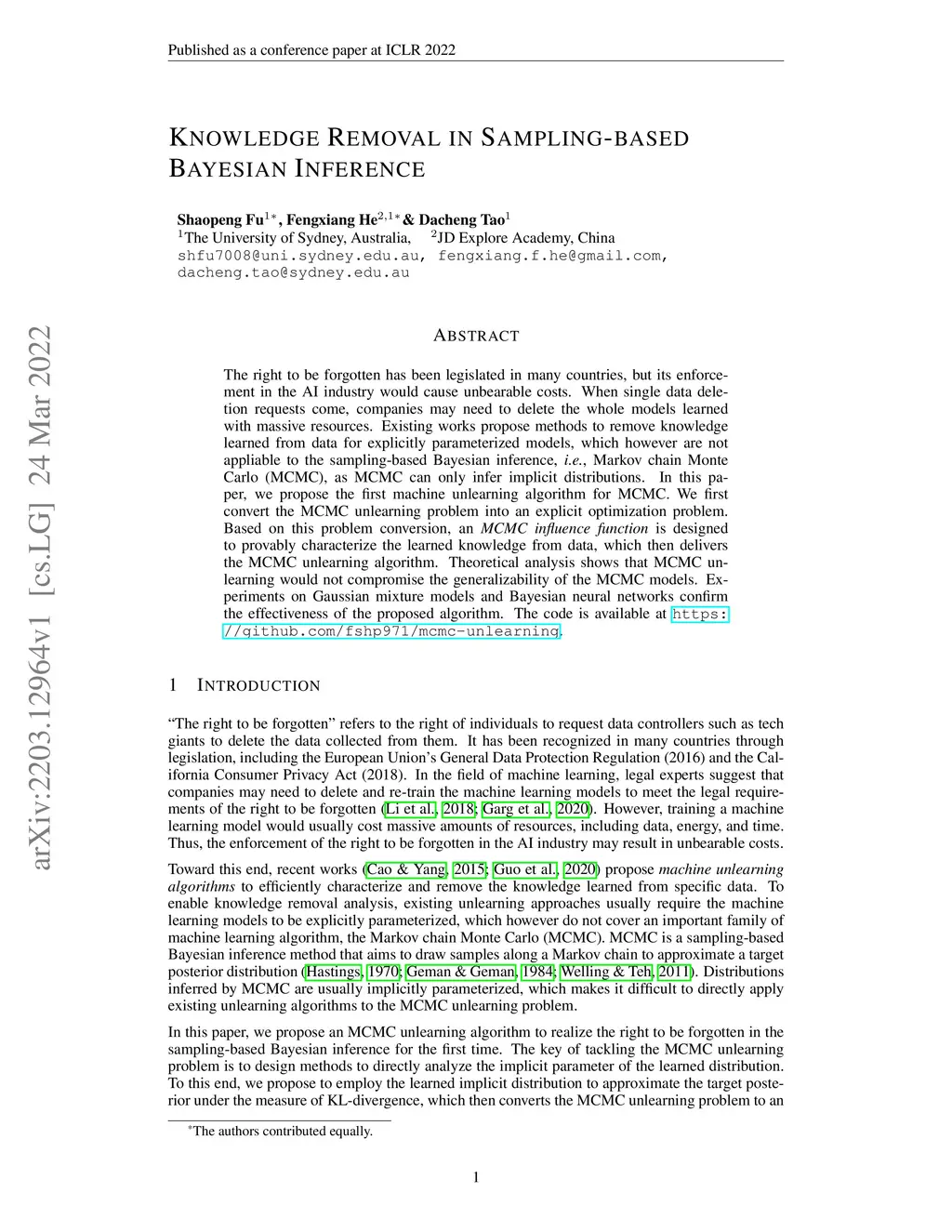 The right to be forgotten has been legislated in many countries, but its enforcement in the AI industry would cause unbearable costs. When single data deletion requests come, companies may need to delete the whole models learned with massive resources. Existing works propose methods to remove knowledge learned from data for explicitly parameterized models, which however are not appliable to the sampling-based Bayesian inference, i.e., Markov chain Monte Carlo (MCMC), as MCMC can only infer implicit distributions. In this paper, we propose the first machine unlearning algorithm for MCMC. We first convert the MCMC unlearning problem into an explicit optimization problem. Based on this problem conversion, an {\it MCMC influence function} is designed to provably characterize the learned knowledge from data, which then delivers the MCMC unlearning algorithm. Theoretical analysis shows that MCMC unlearning would not compromise the generalizability of the MCMC models. Experiments on Gaussian mixture models and Bayesian neural networks confirm the effectiveness of the proposed algorithm. The code is available at \url{https://github.com/fshp971/mcmc-unlearning}.
