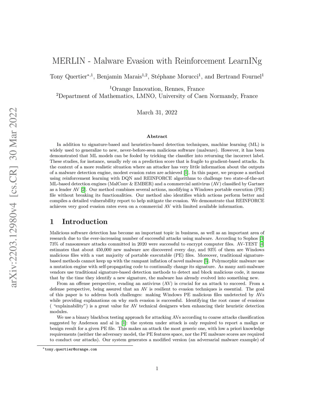 MERLIN -- Malware Evasion with Reinforcement LearnINg