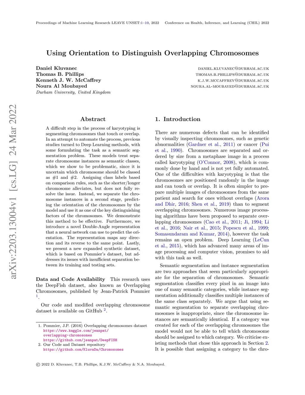 A difficult step in the process of karyotyping is segmenting chromosomes that touch or overlap. In an attempt to automate the process, previous studies turned to Deep Learning methods, with some formulating the task as a semantic segmentation problem. These models treat separate chromosome instances as semantic classes, which we show to be problematic, since it is uncertain which chromosome should be classed as #1 and #2. Assigning class labels based on comparison rules, such as the shorter/longer chromosome alleviates, but does not fully resolve the issue. Instead, we separate the chromosome instances in a second stage, predicting the orientation of the chromosomes by the model and use it as one of the key distinguishing factors of the chromosomes. We demonstrate this method to be effective. Furthermore, we introduce a novel Double-Angle representation that a neural network can use to predict the orientation. The representation maps any direction and its reverse to the same point. Lastly, we present a new expanded synthetic dataset, which is based on Pommier's dataset, but addresses its issues with insufficient separation between its training and testing sets.