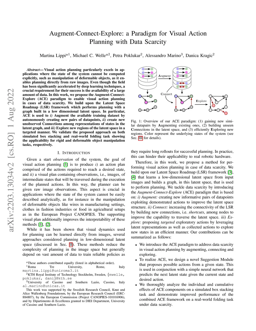 Visual action planning particularly excels in applications where the state of the system cannot be computed explicitly, such as manipulation of deformable objects, as it enables planning directly from raw images. Even though the field has been significantly accelerated by deep learning techniques, a crucial requirement for their success is the availability of a large amount of data. In this work, we propose the Augment-Connect-Explore (ACE) paradigm to enable visual action planning in cases of data scarcity. We build upon the Latent Space Roadmap (LSR) framework which performs planning with a graph built in a low dimensional latent space. In particular, ACE is used to i) Augment the available training dataset by autonomously creating new pairs of datapoints, ii) create new unobserved Connections among representations of states in the latent graph, and iii) Explore new regions of the latent space in a targeted manner. We validate the proposed approach on both simulated box stacking and real-world folding task showing the applicability for rigid and deformable object manipulation tasks, respectively.
