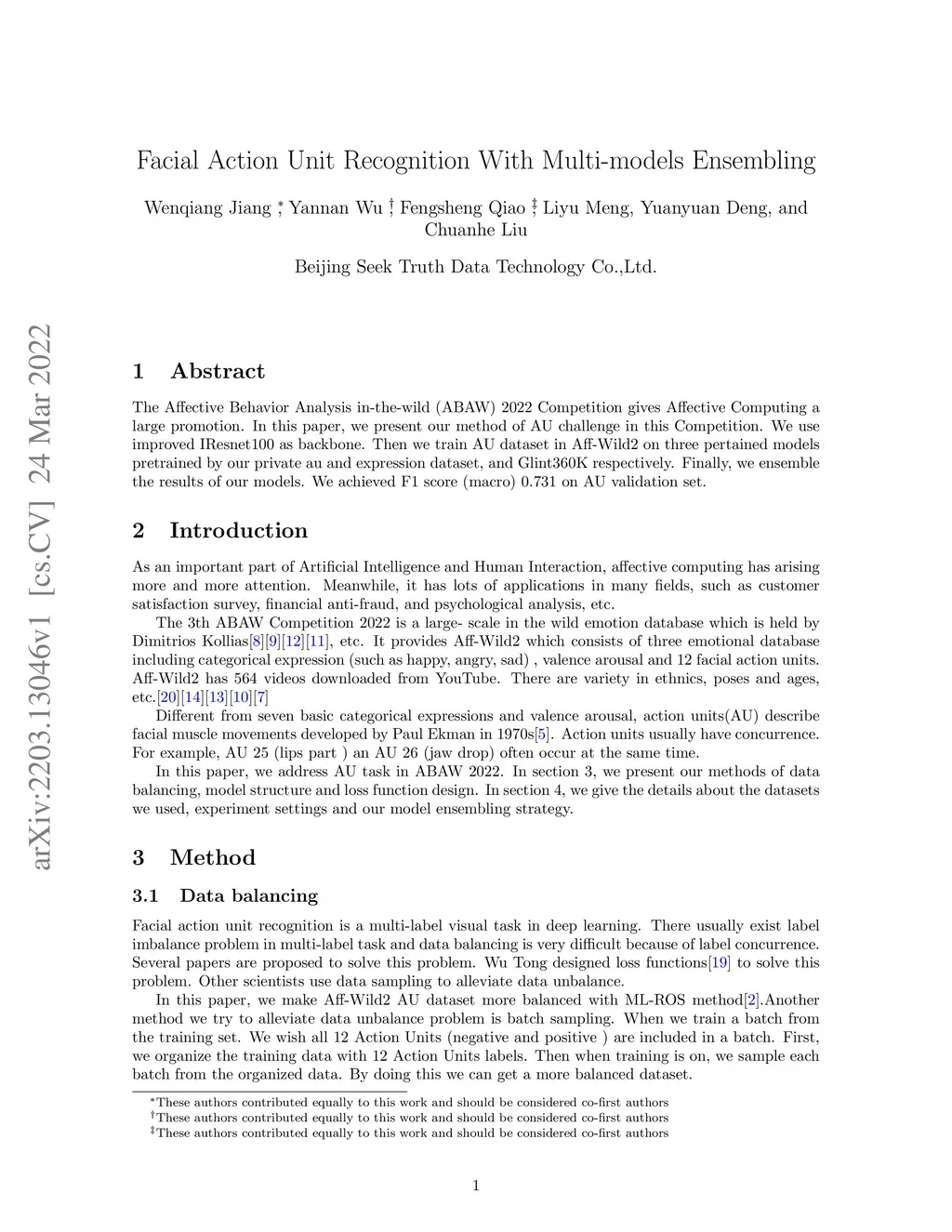 The Affective Behavior Analysis in-the-wild (ABAW) 2022 Competition gives Affective Computing a large promotion. In this paper, we present our method of AU challenge in this Competition. We use improved IResnet100 as backbone. Then we train AU dataset in Aff-Wild2 on three pertained models pretrained by our private au and expression dataset, and Glint360K respectively. Finally, we ensemble the results of our models. We achieved F1 score (macro) 0.731 on AU validation set.