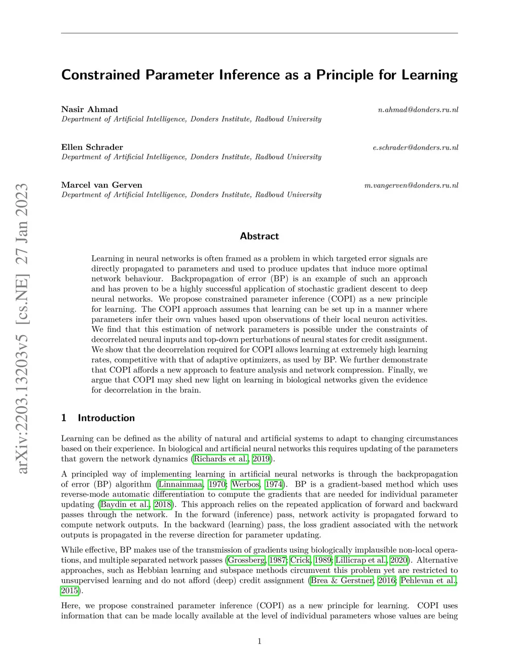 Learning in neural networks is often framed as a problem in which targeted error signals are directly propagated to parameters and used to produce updates that induce more optimal network behaviour. Backpropagation of error (BP) is an example of such an approach and has proven to be a highly successful application of stochastic gradient descent to deep neural networks. We propose constrained parameter inference (COPI) as a new principle for learning. The COPI approach assumes that learning can be set up in a manner where parameters infer their own values based upon observations of their local neuron activities. We find that this estimation of network parameters is possible under the constraints of decorrelated neural inputs and top-down perturbations of neural states for credit assignment. We show that the decorrelation required for COPI allows learning at extremely high learning rates, competitive with that of adaptive optimizers, as used by BP. We further demonstrate that COPI affords a new approach to feature analysis and network compression. Finally, we argue that COPI may shed new light on learning in biological networks given the evidence for decorrelation in the brain.