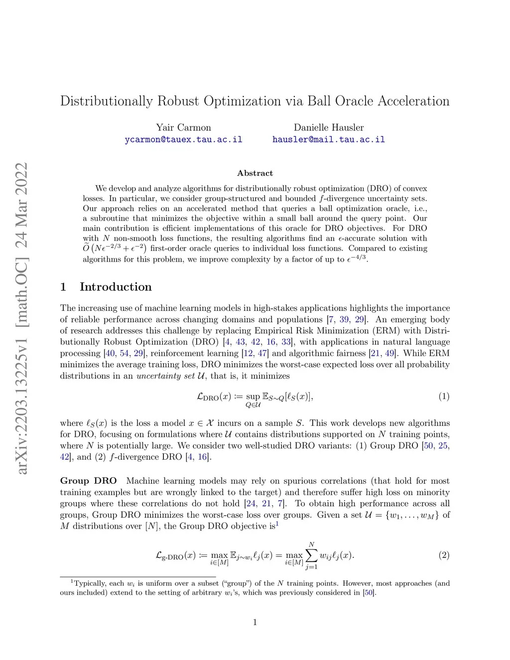 We develop and analyze algorithms for distributionally robust optimization (DRO) of convex losses. In particular, we consider group-structured and bounded -divergence uncertainty sets. Our approach relies on an accelerated method that queries a ball optimization oracle, i.e., a subroutine that minimizes the objective within a small ball around the query point. Our main contribution is efficient implementations of this oracle for DRO objectives. For DRO with non-smooth loss functions, the resulting algorithms find an -accurate solution with first-order oracle queries to individual loss functions. Compared to existing algorithms for this problem, we improve complexity by a factor of up to .