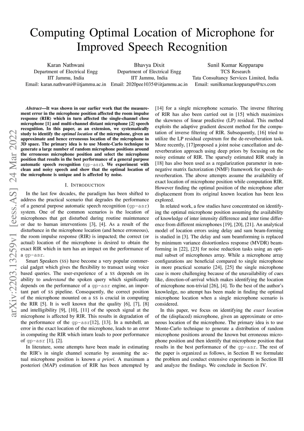It was shown in our earlier work that the measurement error in the microphone position affected the room impulse response (RIR) which in turn affected the single-channel close microphone and multi-channel distant microphone speech recognition. In this paper, as an extension, we systematically study to identify the optimal location of the microphone, given an approximate and hence erroneous location of the microphone in 3D space. The primary idea is to use Monte-Carlo technique to generate a large number of random microphone positions around the erroneous microphone position and select the microphone position that results in the best performance of a general purpose automatic speech recognition (gp-asr). We experiment with clean and noisy speech and show that the optimal location of the microphone is unique and is affected by noise.
