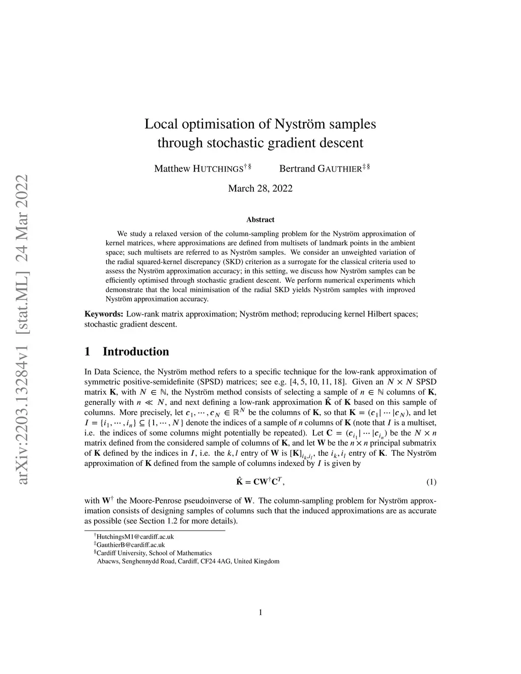 We study a relaxed version of the column-sampling problem for the Nystr\"om approximation of kernel matrices, where approximations are defined from multisets of landmark points in the ambient space; such multisets are referred to as Nystr\"om samples. We consider an unweighted variation of the radial squared-kernel discrepancy (SKD) criterion as a surrogate for the classical criteria used to assess the Nystr\"om approximation accuracy; in this setting, we discuss how Nystr\"om samples can be efficiently optimised through stochastic gradient descent. We perform numerical experiments which demonstrate that the local minimisation of the radial SKD yields Nystr\"om samples with improved Nystr\"om approximation accuracy.