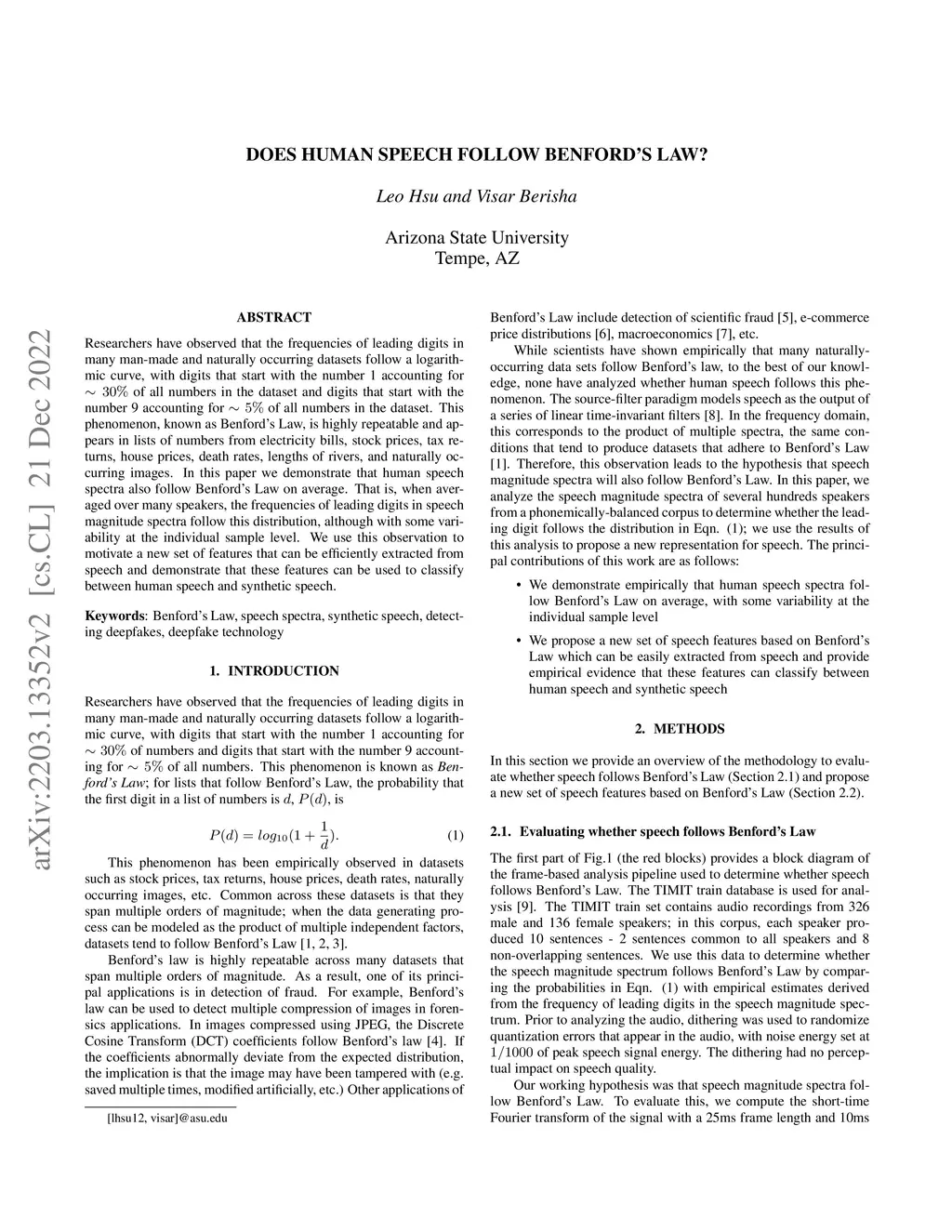 Researchers have observed that the frequencies of leading digits in many man-made and naturally occurring datasets follow a logarithmic curve, with digits that start with the number 1 accounting for of all numbers in the dataset and digits that start with the number 9 accounting for of all numbers in the dataset. This phenomenon, known as Benford's Law, is highly repeatable and appears in lists of numbers from electricity bills, stock prices, tax returns, house prices, death rates, lengths of rivers, and naturally occurring images. In this paper we demonstrate that human speech spectra also follow Benford's Law on average. That is, when averaged over many speakers, the frequencies of leading digits in speech magnitude spectra follow this distribution, although with some variability at the individual sample level. We use this observation to motivate a new set of features that can be efficiently extracted from speech and demonstrate that these features can be used to classify between human speech and synthetic speech.