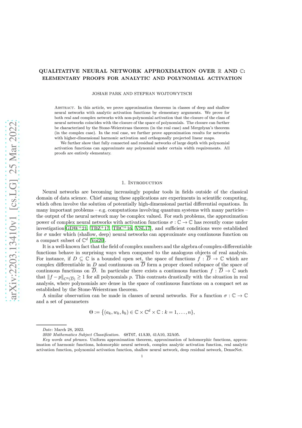 In this article, we prove approximation theorems in classes of deep and shallow neural networks with analytic activation functions by elementary arguments. We prove for both real and complex networks with non-polynomial activation that the closure of the class of neural networks coincides with the closure of the space of polynomials. The closure can further be characterized by the Stone-Weierstrass theorem (in the real case) and Mergelyan's theorem (in the complex case). In the real case, we further prove approximation results for networks with higher-dimensional harmonic activation and orthogonally projected linear maps. We further show that fully connected and residual networks of large depth with polynomial activation functions can approximate any polynomial under certain width requirements. All proofs are entirely elementary.
