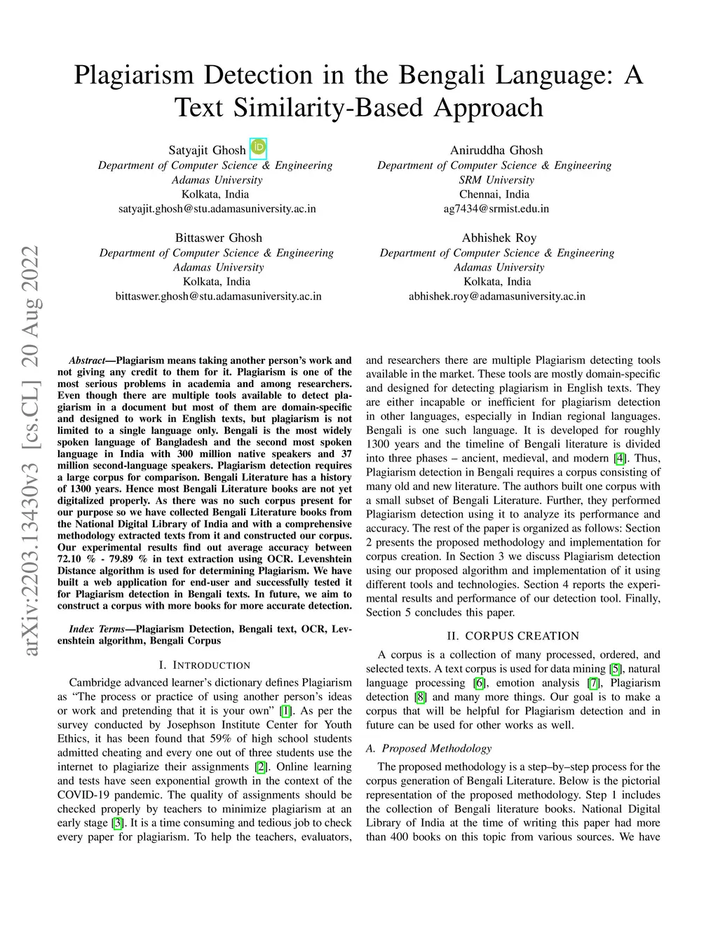 Plagiarism means taking another person's work and not giving any credit to them for it. Plagiarism is one of the most serious problems in academia and among researchers. Even though there are multiple tools available to detect plagiarism in a document but most of them are domain-specific and designed to work in English texts, but plagiarism is not limited to a single language only. Bengali is the most widely spoken language of Bangladesh and the second most spoken language in India with 300 million native speakers and 37 million second-language speakers. Plagiarism detection requires a large corpus for comparison. Bengali Literature has a history of 1300 years. Hence most Bengali Literature books are not yet digitalized properly. As there was no such corpus present for our purpose so we have collected Bengali Literature books from the National Digital Library of India and with a comprehensive methodology extracted texts from it and constructed our corpus. Our experimental results find out average accuracy between 72.10 % - 79.89 % in text extraction using OCR. Levenshtein Distance algorithm is used for determining Plagiarism. We have built a web application for end-user and successfully tested it for Plagiarism detection in Bengali texts. In future, we aim to construct a corpus with more books for more accurate detection.