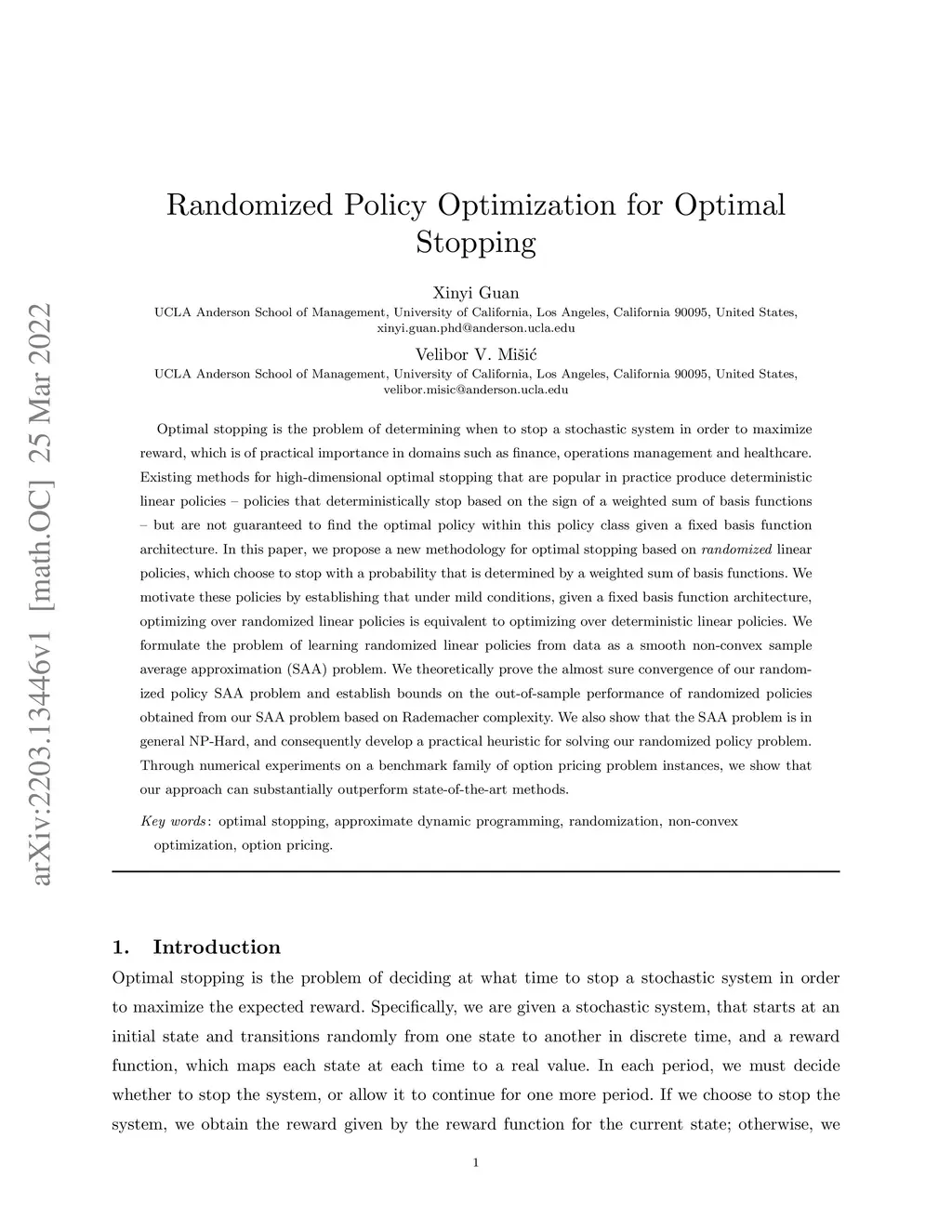 Optimal stopping is the problem of determining when to stop a stochastic system in order to maximize reward, which is of practical importance in domains such as finance, operations management and healthcare. Existing methods for high-dimensional optimal stopping that are popular in practice produce deterministic linear policies -- policies that deterministically stop based on the sign of a weighted sum of basis functions -- but are not guaranteed to find the optimal policy within this policy class given a fixed basis function architecture. In this paper, we propose a new methodology for optimal stopping based on randomized linear policies, which choose to stop with a probability that is determined by a weighted sum of basis functions. We motivate these policies by establishing that under mild conditions, given a fixed basis function architecture, optimizing over randomized linear policies is equivalent to optimizing over deterministic linear policies. We formulate the problem of learning randomized linear policies from data as a smooth non-convex sample average approximation (SAA) problem. We theoretically prove the almost sure convergence of our randomized policy SAA problem and establish bounds on the out-of-sample performance of randomized policies obtained from our SAA problem based on Rademacher complexity. We also show that the SAA problem is in general NP-Hard, and consequently develop a practical heuristic for solving our randomized policy problem. Through numerical experiments on a benchmark family of option pricing problem instances, we show that our approach can substantially outperform state-of-the-art methods.