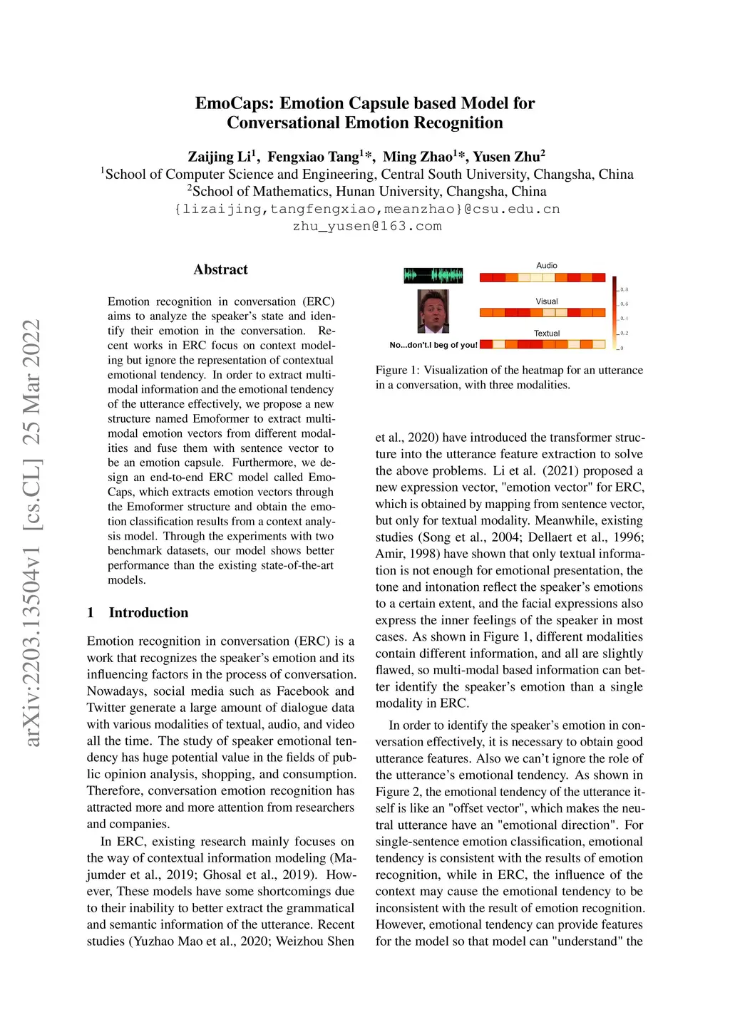 Emotion recognition in conversation (ERC) aims to analyze the speaker's state and identify their emotion in the conversation. Recent works in ERC focus on context modeling but ignore the representation of contextual emotional tendency. In order to extract multi-modal information and the emotional tendency of the utterance effectively, we propose a new structure named Emoformer to extract multi-modal emotion vectors from different modalities and fuse them with sentence vector to be an emotion capsule. Furthermore, we design an end-to-end ERC model called EmoCaps, which extracts emotion vectors through the Emoformer structure and obtain the emotion classification results from a context analysis model. Through the experiments with two benchmark datasets, our model shows better performance than the existing state-of-the-art models.