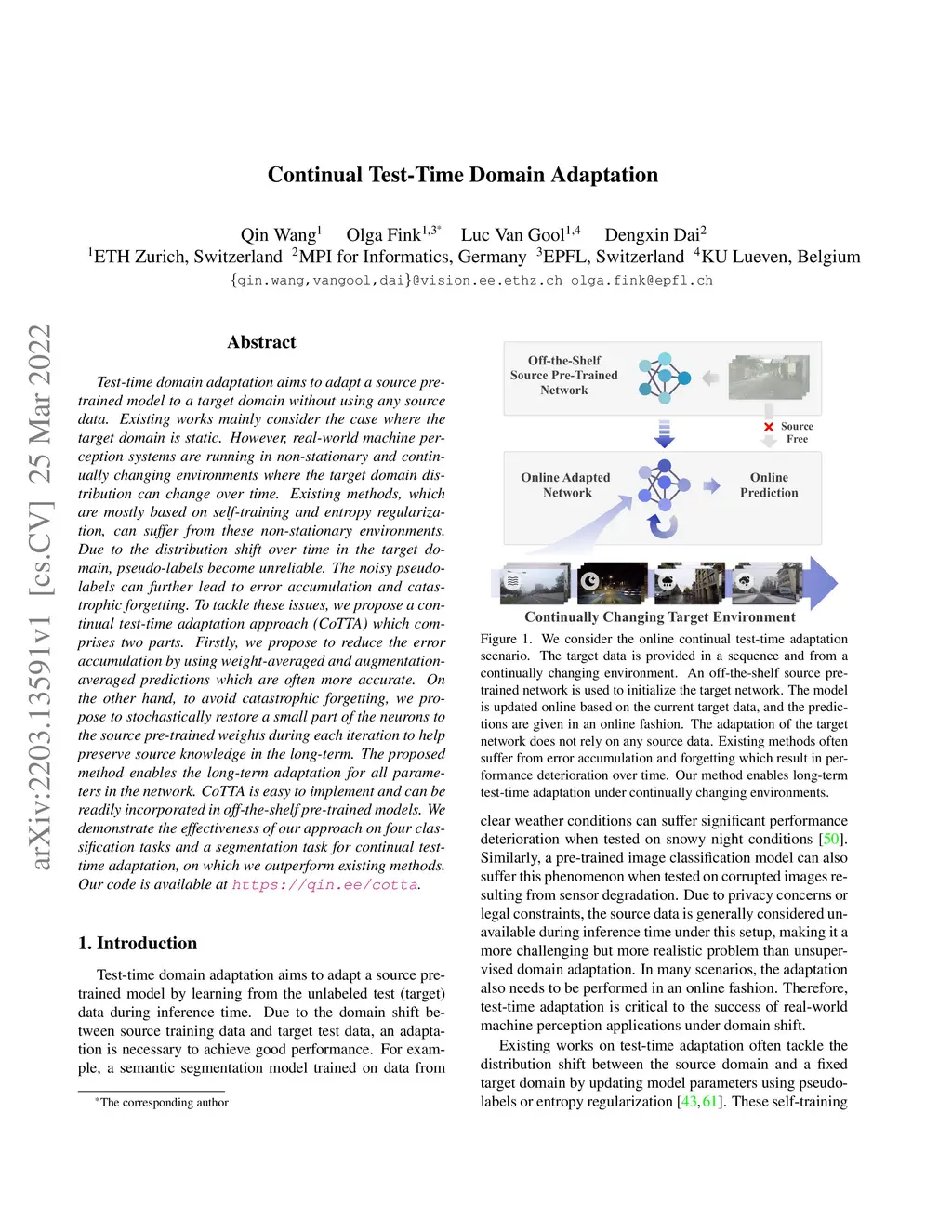Test-time domain adaptation aims to adapt a source pre-trained model to a target domain without using any source data. Existing works mainly consider the case where the target domain is static. However, real-world machine perception systems are running in non-stationary and continually changing environments where the target domain distribution can change over time. Existing methods, which are mostly based on self-training and entropy regularization, can suffer from these non-stationary environments. Due to the distribution shift over time in the target domain, pseudo-labels become unreliable. The noisy pseudo-labels can further lead to error accumulation and catastrophic forgetting. To tackle these issues, we propose a continual test-time adaptation approach~(CoTTA) which comprises two parts. Firstly, we propose to reduce the error accumulation by using weight-averaged and augmentation-averaged predictions which are often more accurate. On the other hand, to avoid catastrophic forgetting, we propose to stochastically restore a small part of the neurons to the source pre-trained weights during each iteration to help preserve source knowledge in the long-term. The proposed method enables the long-term adaptation for all parameters in the network. CoTTA is easy to implement and can be readily incorporated in off-the-shelf pre-trained models. We demonstrate the effectiveness of our approach on four classification tasks and a segmentation task for continual test-time adaptation, on which we outperform existing methods. Our code is available at \url{https://qin.ee/cotta}.