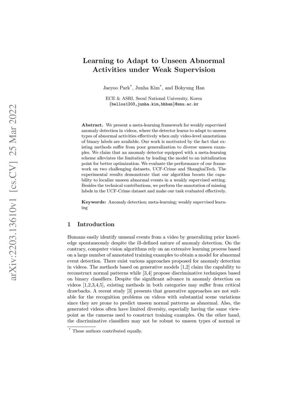 We present a meta-learning framework for weakly supervised anomaly detection in videos, where the detector learns to adapt to unseen types of abnormal activities effectively when only video-level annotations of binary labels are available. Our work is motivated by the fact that existing methods suffer from poor generalization to diverse unseen examples. We claim that an anomaly detector equipped with a meta-learning scheme alleviates the limitation by leading the model to an initialization point for better optimization. We evaluate the performance of our framework on two challenging datasets, UCF-Crime and ShanghaiTech. The experimental results demonstrate that our algorithm boosts the capability to localize unseen abnormal events in a weakly supervised setting. Besides the technical contributions, we perform the annotation of missing labels in the UCF-Crime dataset and make our task evaluated effectively.
