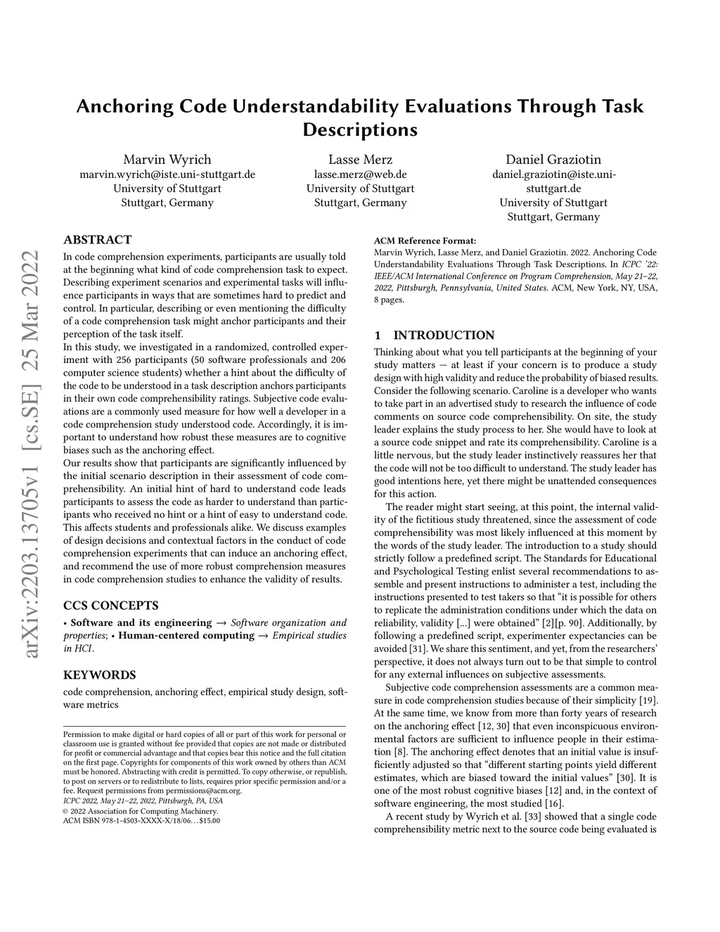 In code comprehension experiments, participants are usually told at the beginning what kind of code comprehension task to expect. Describing experiment scenarios and experimental tasks will influence participants in ways that are sometimes hard to predict and control. In particular, describing or even mentioning the difficulty of a code comprehension task might anchor participants and their perception of the task itself. In this study, we investigated in a randomized, controlled experiment with 256 participants (50 software professionals and 206 computer science students) whether a hint about the difficulty of the code to be understood in a task description anchors participants in their own code comprehensibility ratings. Subjective code evaluations are a commonly used measure for how well a developer in a code comprehension study understood code. Accordingly, it is important to understand how robust these measures are to cognitive biases such as the anchoring effect. Our results show that participants are significantly influenced by the initial scenario description in their assessment of code comprehensibility. An initial hint of hard to understand code leads participants to assess the code as harder to understand than participants who received no hint or a hint of easy to understand code. This affects students and professionals alike. We discuss examples of design decisions and contextual factors in the conduct of code comprehension experiments that can induce an anchoring effect, and recommend the use of more robust comprehension measures in code comprehension studies to enhance the validity of results.